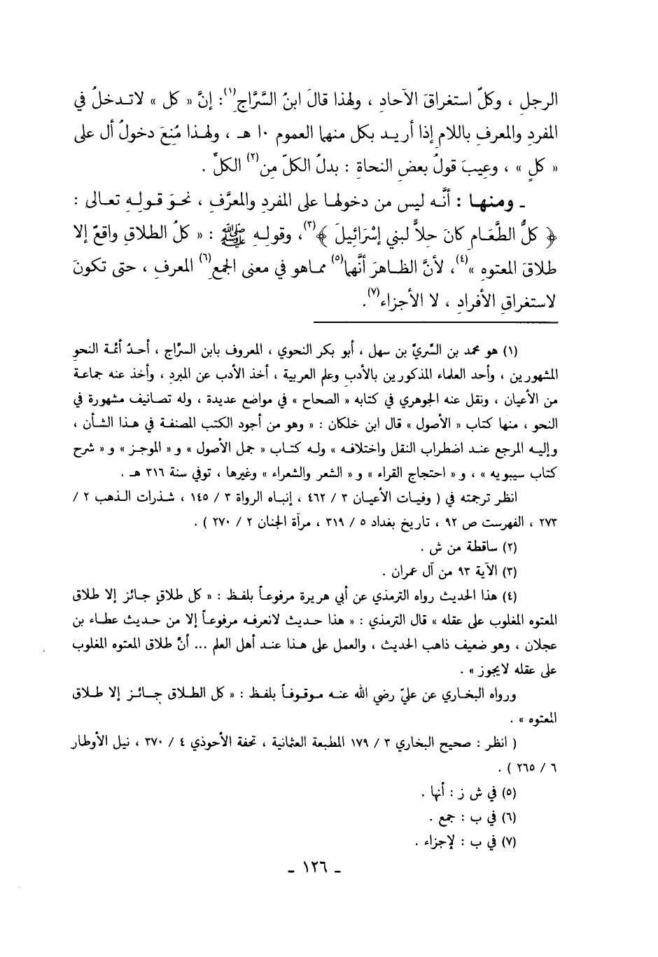 وَمِنْهَا: أَنَّهُ لَيْسَ مِنْ دُخُولِهَا عَلَى الْمُفْرَدِ وَالْمُعَرَّفِ. نَحْوَ قَوْله تَعَالَى: {كُلُّ الطَّعَامِ كَانَ حِلاًّ لِبَنِي إسْرَائِيلَ} 3 وَقَوْلِهِ صَلَّى اللَّهُ عَلَيْهِ وَسَلَّمَ: "كُلُّ الطَّلاقِ وَاقِعٌ إلاَّ طَلاقَ الْمَعْتُوهِ" 4 لأَنَّ الظَّاهِرَ أَنَّهَا5 مِمَّا هُوَ فِي مَعْنَى الْجَمْعِ 6الْمُعَرَّفِ، حَتَّى تَكُونَ لاسْتِغْرَاقِ الأَفْرَادِ لا الأَجْزَاءِ 7.