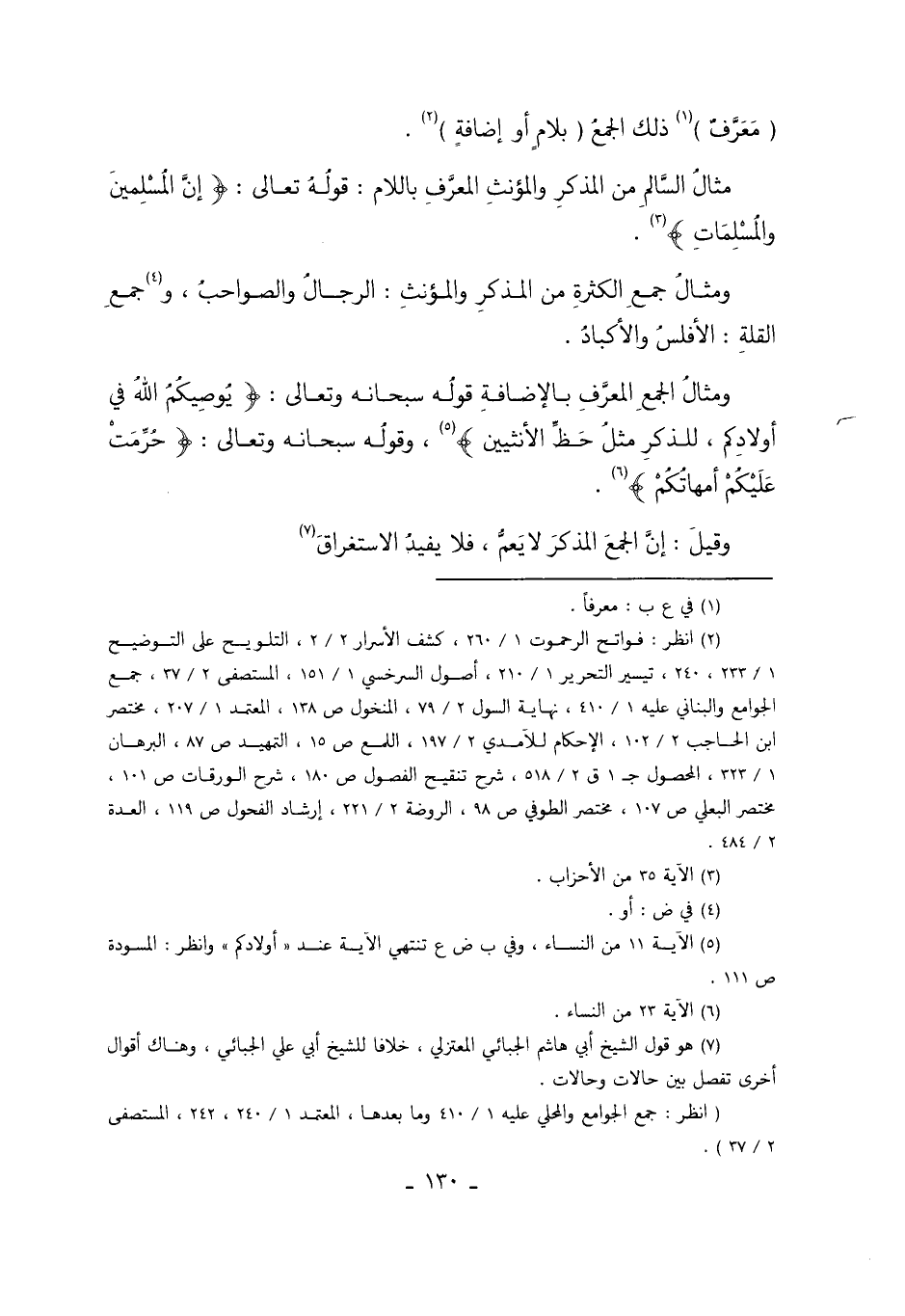 مِثَالُ السَّالِمِ مِنْ الْمُذَكَّرِ وَالْمُؤَنَّثِ الْمُعَرَّفِ بِاللاَّمِ: قَوْله تَعَالَى: {إنَّ الْمُسْلِمِينَ وَالْمُسْلِمَاتِ} 3 وَمِثَالُ جَمْعِ الْكَثْرَةِ مِنْ الْمُذَكَّرِ وَالْمُؤَنَّثِ الرِّجَالُ وَالصَّوَاحِبُ. وَ4جَمْعُ الْقِلَّةِ: الأَفْلَسُ وَالأَكْبَادُ، وَمِثَالُ الْجَمْعِ الْمُعَرَّفِ بِالإِضَافَةِ قَوْله تَعَالَى: {يُوصِيكُمْ اللَّهُ فِي أَوْلادِكُمْ لِلذَّكَرِ مِثْلُ حَظِّ الأُنْثَيَيْنِ} 5 وقَوْله تَعَالَى: {حُرِّمَتْ عَلَيْكُمْ أُمَّهَاتُكُمْ} 6 وَقِيلَ: إنَّ الْجَمْعَ الْمُذَكَّرَ لا يَعُمُّ، فَلا يُفِيدُ الاسْتِغْرَاقَ7.