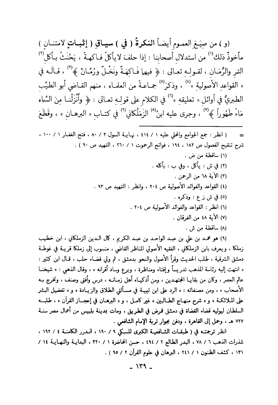 9 وهو محمد بن علي بن عبد الواحد بن عبد الكريم، كمال الدين الزملكاني، ابن خطيب زملكا، ويعرف بابن الزملكاني، الفقيه الأصولي المناظر القاضي، منسوب إلى زملكا قرية في غوطة دمشق الشرقية، طلب الحديث وقرأ الأصول والنحو بدمشق، ثم ولي قضاء حلب، قال ابن كثير: "انتهت إليه رئاسة المذهب تدريساً وإفتاء ومناظرة، وبرع وساد أقرانه" وقال الذهبي: "شيخنا عالم العصر، وكان من بقايا المجتهدين، ومن أذكياء أهل زمانه، درس وأفتى وصنف، وتخرج به الأصحاب"، ومن مصنفاته: "الرد على ابن تيمية في مسألتي الطلاق والزيادة" و "تفضيل البشر على الملائكة" و "شرح منهاج الطالبين" غير كامل، و"البرهان في إعجاز القران"، طلبه السلطان ليوليه قضاء القضاء في دمشق فمرض في الطريق، ومات بمدينة بلبيس من أعمال مصر سنة 727هـ، وحمل إلى القاهرة، ودفن بجوار تربة الإمام الشافعي.