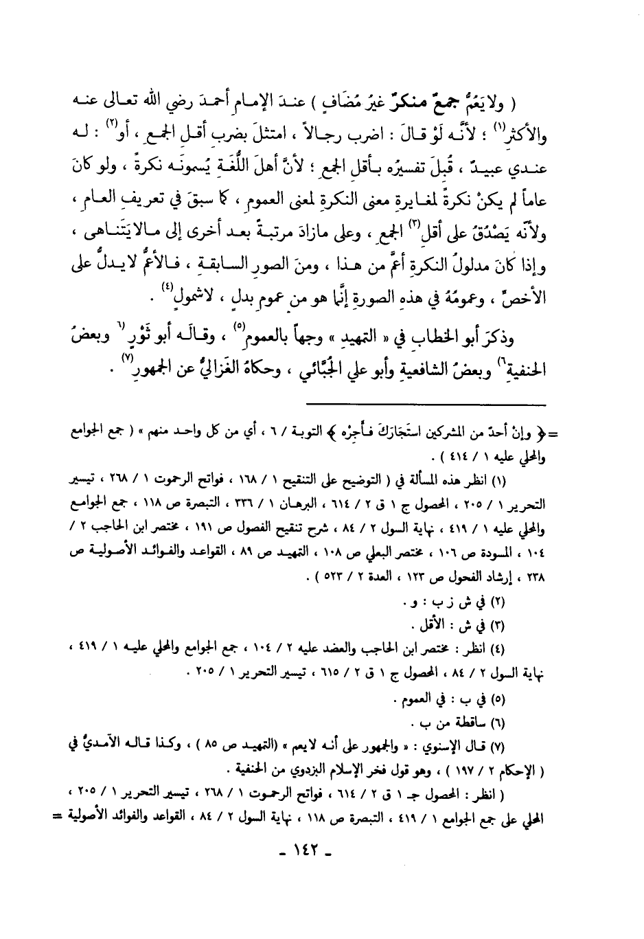 "وَلا يَعُمُّ جَمْعٌ مُنْكَرٌ غَيْرُ مُضَافٍ" عِنْدَ الإِمَامِ أَحْمَدَ رَضِيَ اللَّهُ تَعَالَى عَنْهُ وَالأَكْثَرِ1؛ لأَنَّهُ لَوْ قَالَ: اضْرِبْ رِجَالاً، امْتَثَلَ بِضَرْبِ أَقَلِّ الْجَمْعِ، أَوْ2 لَهُ عِنْدِي عَبِيدٌ، قَبْلَ تَفْسِيرِهِ بِأَقَلِّ الْجَمْعِ، لأَنَّ أَهْلَ اللُّغَةِ يُسَمُّونَهُ نَكِرَةً، وَلَوْ كَانَ عَامًّا لَمْ يَكُنْ نَكِرَةً لِمُغَايَرَةِ مَعْنَى النَّكِرَةِ لِمَعْنَى الْعُمُومِ، كَمَا سَبَقَ فِي تَعْرِيفِ الْعَامِّ، وَلأَنَّهُ يَصْدُقُ عَلَى أَقَلِّ3 الْجَمْعِ، وَعَلَى مَا زَادَ مَرْتَبَةٌ بَعْدَ أُخْرَى إلَى مَا لا يَتَنَاهَى، وَإِذَا كَانَ مَدْلُولُ النَّكِرَةِ أَعَمَّ مِنْ هَذَا وَمِنْ الصُّوَرِ السَّابِقَةِ، فَالأَعَمُّ لا يَدُلُّ عَلَى الأَخَصِّ. وَعُمُومُهُ فِي هَذِهِ الصُّورَةِ إنَّمَا هُوَ مِنْ عُمُومِ بَدَلٍ لا شُمُولٍ4.