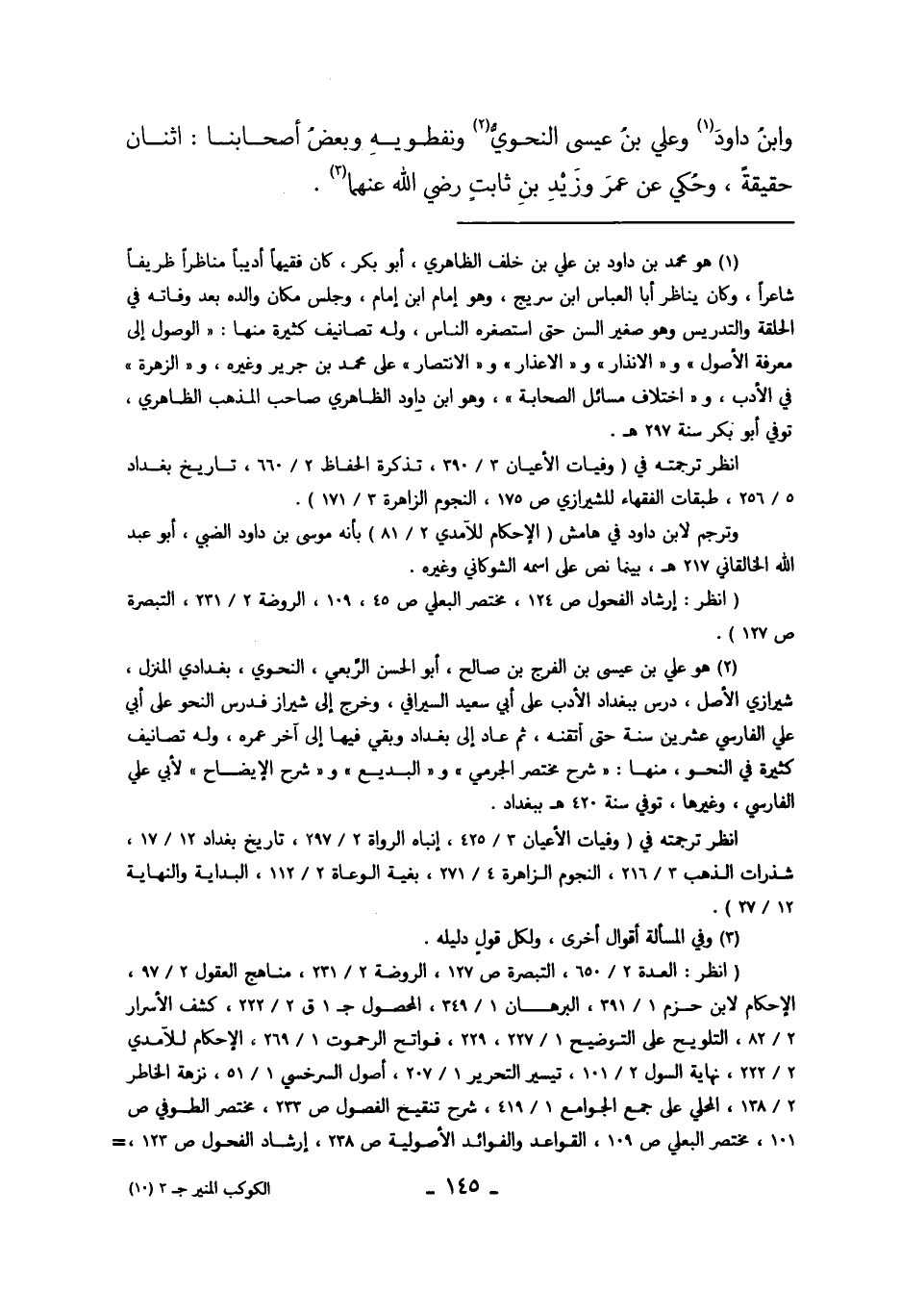 1 هو محمد بن داود بن علي بن خلف الظاهري، أبو بكر، كان فقيهاً أديباً مناظراً ظريفاً شاعراً، وكان يناظر أبا العباس ابن سريج، وهو إمام ابن إمام، وجلس مكان والده بعد وفاته في الحلقة والتدريس وهو صغير السن حتى استصغره الناس، وله تصانيف كثيرة منها: "الوصول إلى معرفة الأصول" و "الانذار" و "الاعذار" والانتصار" على محمد بن جرير وغيره، و"الزهرة" في الأدب، و "اختلاف مسائل الصحابة"، وهو ابن داود الظاهري، توفي أبو بكر سنة297 هـ.