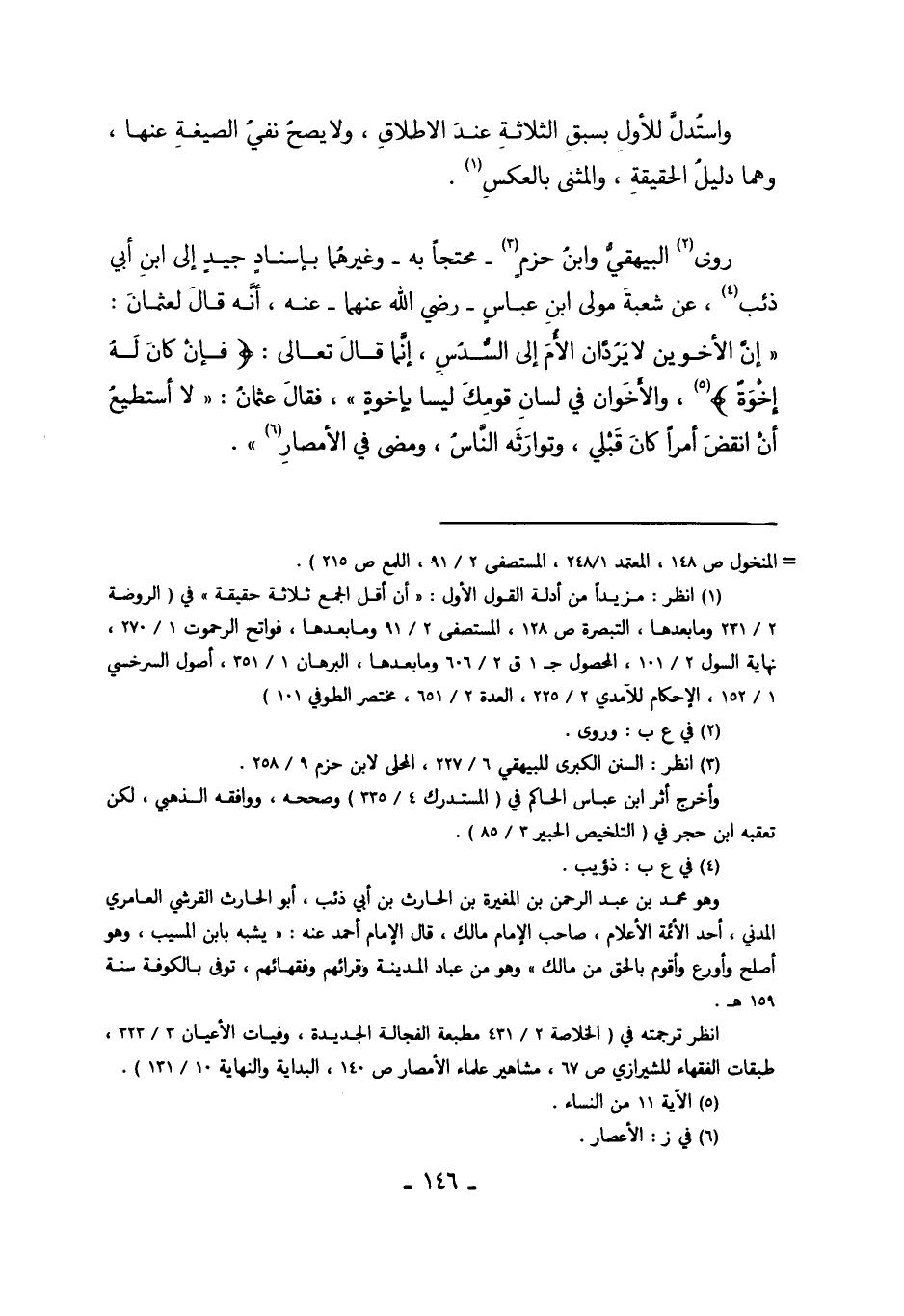 رَوَى2 الْبَيْهَقِيُّ وَابْنُ حَزْمٍ3 -مُحْتَجًّا بِهِ- وَغَيْرُهُمَا بِإِسْنَادٍ جَيِّدٍ إلَى ابْنِ أَبِي ذِئْبٍ4 عَنْ شُعْبَةَ مَوْلَى ابْنِ عَبَّاسٍ. رَضِيَ اللَّهُ عَنْهُمَا عنْهُ؛ أَنَّهُ قَالَ لِعُثْمَانَ "إنَّ الأَخَوَيْنِ لا يَرُدَّانِ الأُمَّ إلَى السُّدُسِ. إنَّمَا قَالَ اللَّهُ تَعَالَى: {فَإِنْ كَانَ لَهُ إخْوَةٌ} 5 وَالأَخَوَانِ فِي لِسَانِ قَوْمِك لَيْسَا بِإِخْوَةٍ, فَقَالَ عُثْمَانُ: لا أَسْتَطِيعُ أَنْ أَنْقُضَ أَمْرًا كَانَ قَبْلِي، وَتَوَارَثَهُ النَّاسُ، وَمَضَى فِي الأَمْصَارِ6".