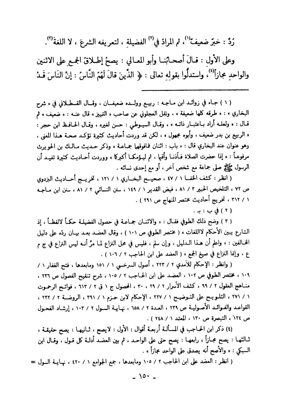 3 وضح ذلك الطوفي فقال: "والاثنان جماعة في حصول الفضيلة حكماً لا لفظاً، إذ الشارع يبين الأحكام لا اللغات" "مختصر الطوفي ص101"، وقال العضد بعد بيان رده على دليل المخالفين: "واعلم أن هذا الدليل، وإن سلم، فليس في محل النزاع لما مر انه ليس النزاع في ج م ع، وإنما النزاع في صيغ الجمع" "العضد على ابن الحاجب 2/106".