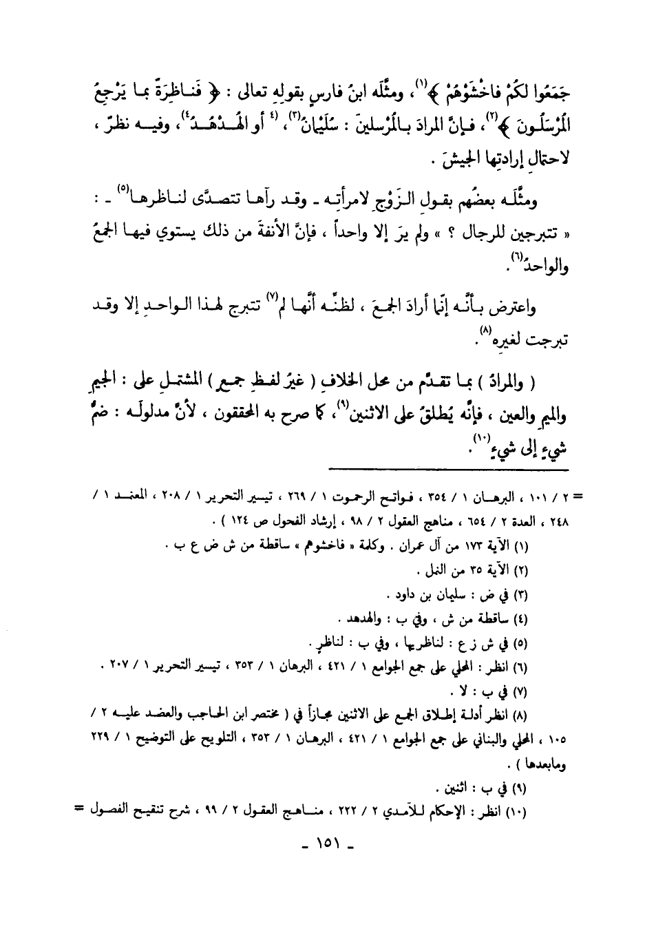 8 انظر أدلة إطلاق الجمع على الاثنين مجازاً في "مختصر ابن الحاجب والعضد عليه 2/105، المحلي والبناني على جمع الجوامع 1/421، البرهان 1/353، التلويح على التوضيح 1/229وما بعدها".