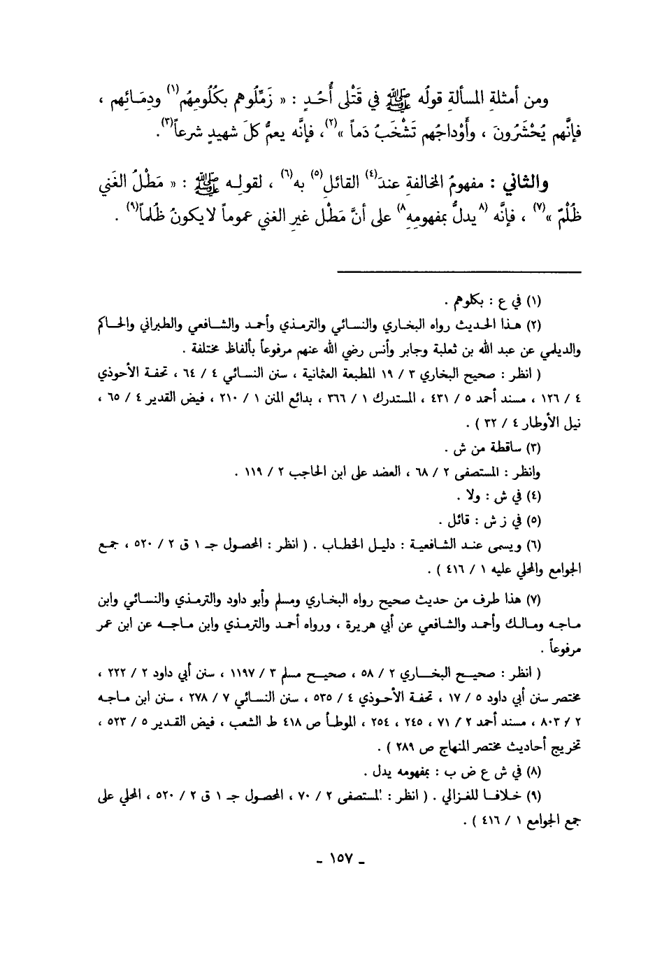 وَمِنْ أَمْثِلَةِ الْمَسْأَلَةِ قَوْلُهُ صَلَّى اللَّهُ عَلَيْهِ وَسَلَّمَ فِي قَتْلَى أُحُدٍ "زَمِّلُوهُمْ بِكُلُومِهِمْ 1 وَدِمَائِهِمْ، فَإِنَّهُمْ يُحْشَرُونَ وَأَوْدَاجُهُمْ تَشْخَبُ دَمًا" 2 فَإِنَّهُ يَعُمُّ كُلَّ شَهِيدٍ شَرْعًا3.