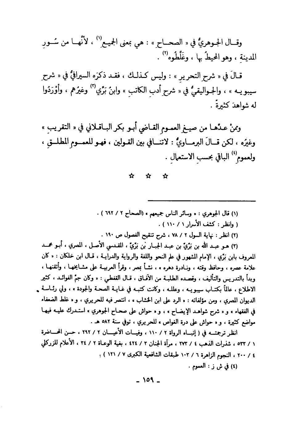 قَالَ فِي شَرْحِ التَّحْرِيرِ: وَلَيْسَ كَذَلِكَ، فَقَدْ ذَكَرَهُ السِّيرَافِيُّ فِي شَرْحِ سِيبَوَيْهِ، وَالْجَوَالِيقِيُّ فِي شَرْحِ أَدَبِ الْكَاتِبِ، وَابْنُ بَرِّيٍّ3 وَغَيْرُهُمْ، وَأَوْرَدُوا لَهُ شَوَاهِدَ كَثِيرَةً.