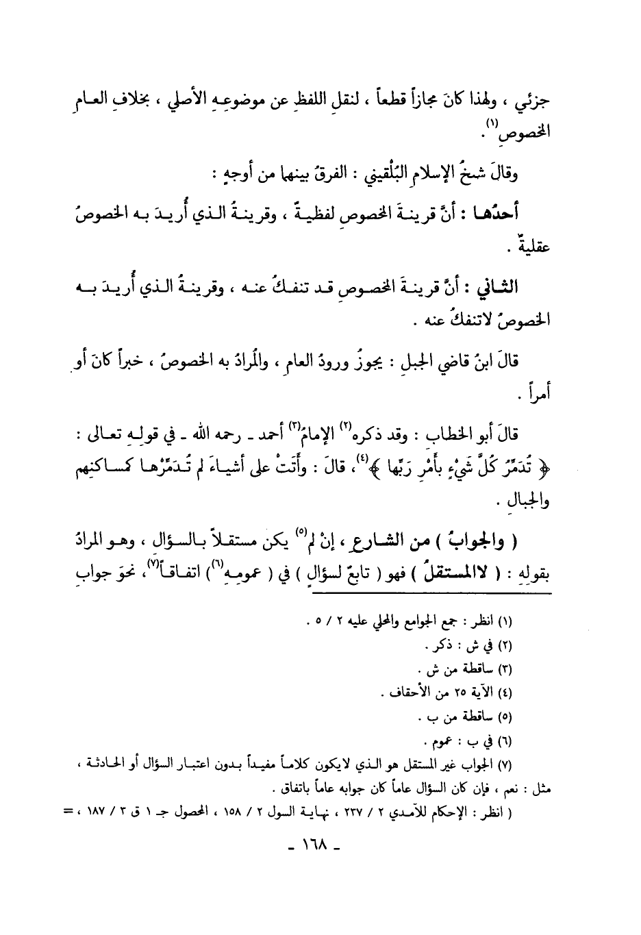 7 الجواب غير المستقل هو الذي لا يكون كلاماً مفيداً بدون اعتبار السؤال أو الحادثة، مثل نعم، فإن كان السؤال عاماً كان جوابه عاماً باتفاق.