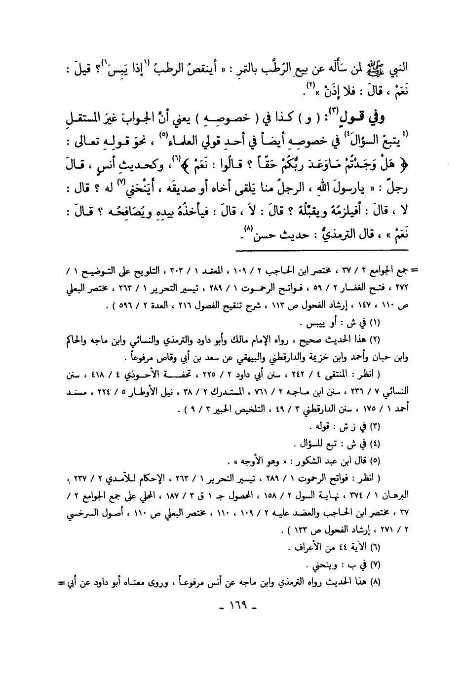 وَفِي قَوْلِ3: "وَ" كَذَا فِي "خُصُوصِهِ" يَعْنِي أَنَّ الْجَوَابَ غَيْرَ الْمُسْتَقِلِّ يَتْبَعُ السُّؤَالَ4 فِي خُصُوصِهِ أَيْضًا فِي أَحَدِ قَوْلَيْ الْعُلَمَاءِ5، نَحْوُ قَوْله تَعَالَى: {هَلْ وَجَدْتُمْ مَا وَعَدَ رَبُّكُمْ حَقًّا قَالُوا نَعَمْ} 6 وَكَحَدِيثِ أَنَسٍ: قَالَ رَجُلٌ: يَا رَسُولَ اللَّهِ، الرَّجُلُ مِنَّا يَلْقَى أَخَاهُ أَوْ صَدِيقَهُ، أَيَنْحَنِي7 لَهُ؟ قَالَ: "لا".قَالَ: أَفَيَلْزَمُهُ وَيُقَبِّلُهُ؟ قَالَ: "لا". قَالَ: فَيَأْخُذُهُ بِيَدِهِ وَيُصَافِحُهُ؟ قَالَ: "نَعَمْ" قَالَ التِّرْمِذِيُّ: حَدِيثٌ حَسَنٌ8.