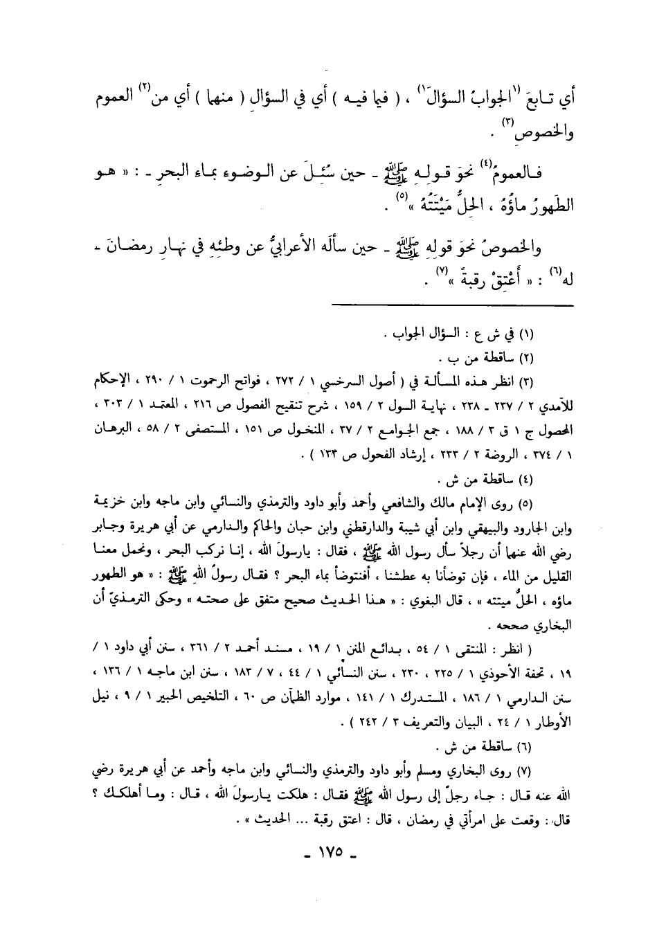 فَالْعُمُومُ4 نَحْوُ قَوْلِهِ صَلَّى اللَّهُ عَلَيْهِ وَسَلَّمَ حِينَ سُئِلَ عَنْ الْوُضُوءِ بِمَاءِ الْبَحْرِ: "هُوَ الطَّهُورُ مَاؤُهُ، الْحِلُّ مَيْتَتُهُ" 5.