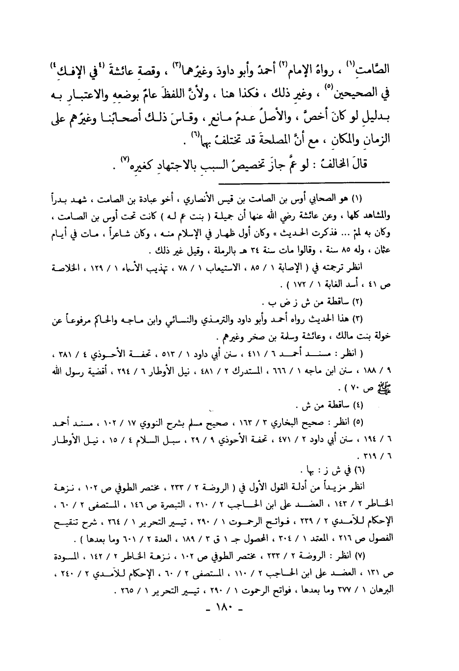 الصَّامِتِ1. رَوَاهُ 2أَحْمَدُ وَأَبُو دَاوُد وَغَيْرُهُمَا3. وَقِصَّةِ عَائِشَةَ فِي الإِفْكِ4 فِي الصَّحِيحَيْنِ5، وَغَيْرِ ذَلِكَ, فَكَذَا هُنَا, وَلأَنَّ اللَّفْظَ عَامٌّ بِوَضْعِهِ وَالاعْتِبَارُ بِهِ بِدَلِيلٍ لَوْ كَانَ أَخَصَّ, وَالأَصْلُ عَدَمُ مَانِعٍ, وَقَاسَ ذَلِكَ أَصْحَابُنَا وَغَيْرُهُمْ عَلَى الزَّمَانِ وَالْمَكَانِ، مَعَ أَنَّ الْمَصْلَحَةَ قَدْ تَخْتَلِفُ بِهِمَا6