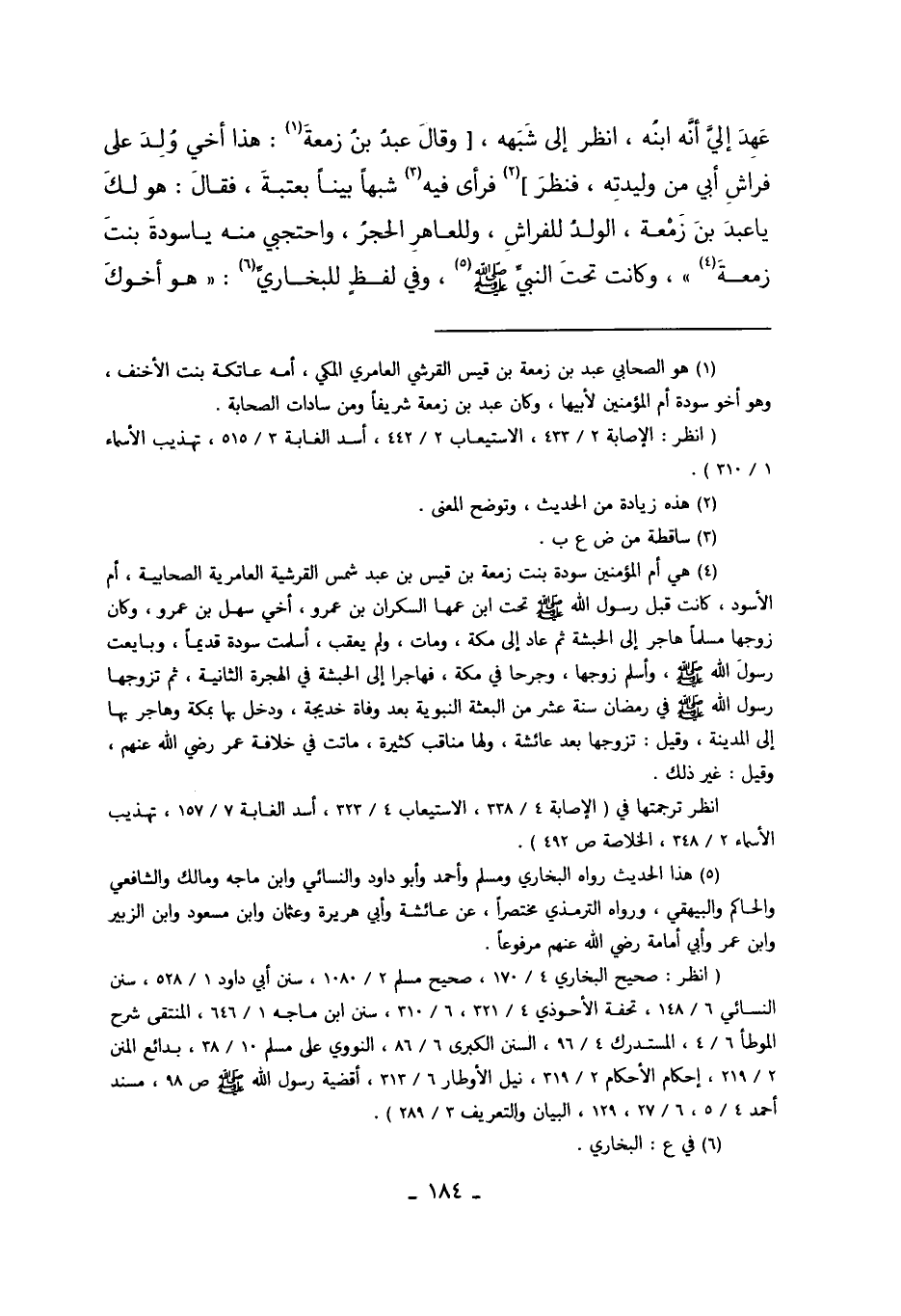 عَهِدَ إلَيَّ أَنَّهُ ابْنُهُ، اُنْظُرْ إلَى شَبَهِهِ "وَقَالَ عَبْدُ بْنُ زَمْعَةَ1 هَذَا أَخِي وُلِدَ عَلَى فِرَاشِ أَبِي مِنْ وَلِيدَتِهِ فَنَظَرَ"2, فَرَأَى فِيهِ3 شَبَهًا بَيِّنًا بِعُتْبَةَ، فَقَالَ: "هُوَ لَك يَا عَبْدُ بْنُ زَمْعَةَ، الْوَلَدُ لِلْفِرَاشِ، وَلِلْعَاهِرِ الْحَجَرُ, وَاحْتَجِبِي مِنْهُ يَا سَوْدَةُ بِنْتُ زَمْعَةَ" 4, وَكَانَتْ تَحْتَ النَّبِيِّ صَلَّى اللَّهُ عَلَيْهِ وَسَلَّمَ5 وَفِي لَفْظٍ لِلْبُخَارِيِّ6 "هُوَ أَخُوك