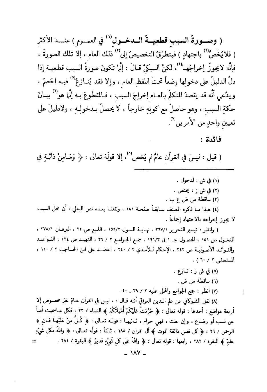 8 نقل الشوكاني عن علم الدين العراقي أنه قال: "ليس في القرآن عام غير مخصوص إلا أربعة مواضع: أحدها: قوله تعالى: {حُرِّمَتْ عَلَيْكُمْ أُمَّهَاتُكُمْ} النساء/23، فكا ما سميت أما عن نسب أو رضاع، وإن علت، فهي حرام، ثانيها: قوله تعالى: {كُلُّ مَنْ عَلَيْهَا فَانٍ} الرحمن/26، {كُلُّ نَفْسٍ ذَآئِقَةُ الْمَوْتِ} آل عمران/185، ثالثاً: قوله تعالى: {وَاللهُ بِكُلِّ شَيْءٍ عَلِيمٌ} البقرة/284، ثم اعترض الشوكاني على الموضع الرابع بأن القدرة لا تتعلق بالمستحيلات، وهي أشياء، ثم ألحق الشوكاني بما سبق قوله تعالى: {وَمَا مِن دَآبَّةٍ فِي الأَرْضِ إِلاَّ عَلَى اللهِ رِزْقُهَا} هود/6.