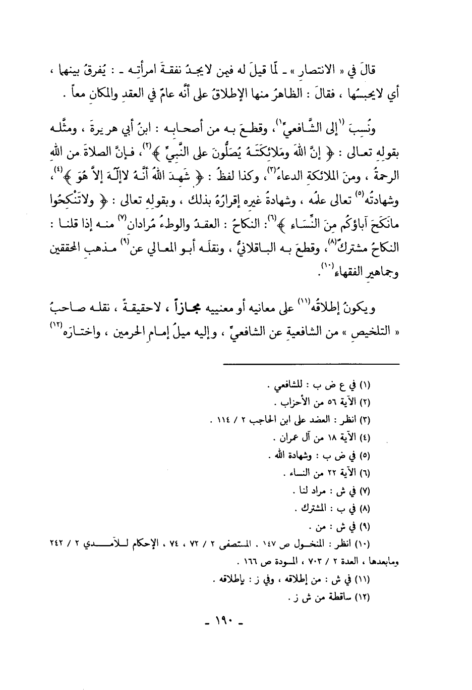 وَنُسِبَ إلَى الشَّافِعِيِّ1. وَقَطَعَ بِهِ مِنْ أَصْحَابِهِ: ابْنُ أَبِي هُرَيْرَةَ، وَمَثَّلَهُ بِقَوْله تَعَالَى: {إنَّ اللَّهَ وَمَلائِكَتَهُ يُصَلُّونَ عَلَى النَّبِيِّ} 2 فَإِنَّ الصَّلاةَ مِنْ اللَّهِ الرَّحْمَةُ، وَمِنْ الْمَلائِكَةِ الدُّعَاءُ3وَكَذَا لَفْظُ {شَهِدَ اللَّهُ أَنَّهُ لا إِلَهَ إِلَّا هُوَ} 4 وَشَهَادَتُهُ تَعَالَى5 عِلْمُهُ، وَشَهَادَةُ غَيْرِهِ إقْرَارُهُ بِذَلِكَ. وَبِقَوْله تَعَالَى: {وَلا تَنْكِحُوا مَا نَكَحَ آبَاؤُكُمْ مِنْ النِّسَاءِ} 6 النِّكَاحُ الْعَقْدُ، وَالْوَطْءُ مُرَادَانِ7 لَنَا مِنْهُ إذَا قُلْنَا: النِّكَاحُ مُشْتَرَكٌ8. وَقَطَعَ بِهِ الْبَاقِلاَّنِيُّ, وَنَقَلَهُ أَبُو الْمَعَالِي عَنْ9 مَذْهَبِ الْمُحَقِّقِينَ وَجَمَاهِيرِ الْفُقَهَاءِ10.