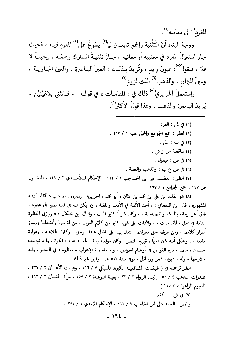 وَوَجْهُ الْبِنَاءِ: أَنَّ التَّثْنِيَةَ وَالْجَمْعَ تَابِعَانِ لِمَا3 يُسَوَّغُ عَلَى4 الْمُفْرَدِ فِيهِ، فَحَيْثُ جَازَ اسْتِعْمَالُ الْمُفْرَدِ فِي مَعْنَيَيْهِ أَوْ مَعَانِيهِ جَازَ تَثْنِيَةُ الْمُشْتَرَكِ وَجَمْعُهُ، وَحَيْثُ لا فَلا، فَتَقُولُ5: عُيُونُ زَيْدٍ، وَتُرِيدُ: بِذَلِكَ الْعَيْنَ الْبَاصِرَةَ، وَالْعَيْنَ الْجَارِيَةَ، وَعَيْنَ الْمِيزَانِ، وَالذَّهَبِ6 الَّذِي لِزَيْدٍ7.