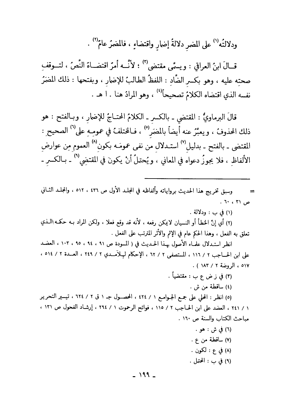 قَالَ الْبِرْمَاوِيُّ: الْمُقْتَضِي -بِالْكَسْرِ-: الْكَلامُ الْمُحْتَاجُ لِلإِضْمَارِ، وَبِالْفَتْحِ: هُوَ ذَلِكَ الْمَحْذُوفُ. وَيُعَبَّرُ عَنْهُ أَيْضًا بِالْمُضْمَرِ5, فَالْمُخْتَلَفُ فِي عُمُومِهِ: عَلَى6 الصَّحِيحِ الْمُقْتَضَى -بِالْفَتْحِ- بِدَلِيلِ7 اسْتِدْلالِ مَنْ نَفَى عُمُومَهُ بِكَوْنِ8 الْعُمُومِ مِنْ عَوَارِضِ الأَلْفَاظِ، فَلا يَجُوزُ دَعْوَاهُ فِي الْمَعَانِي. وَيَحْتَمِلُ أَنْ يَكُونَ فِي الْمُقْتَضِي9 -بِالْكَسْرِ–