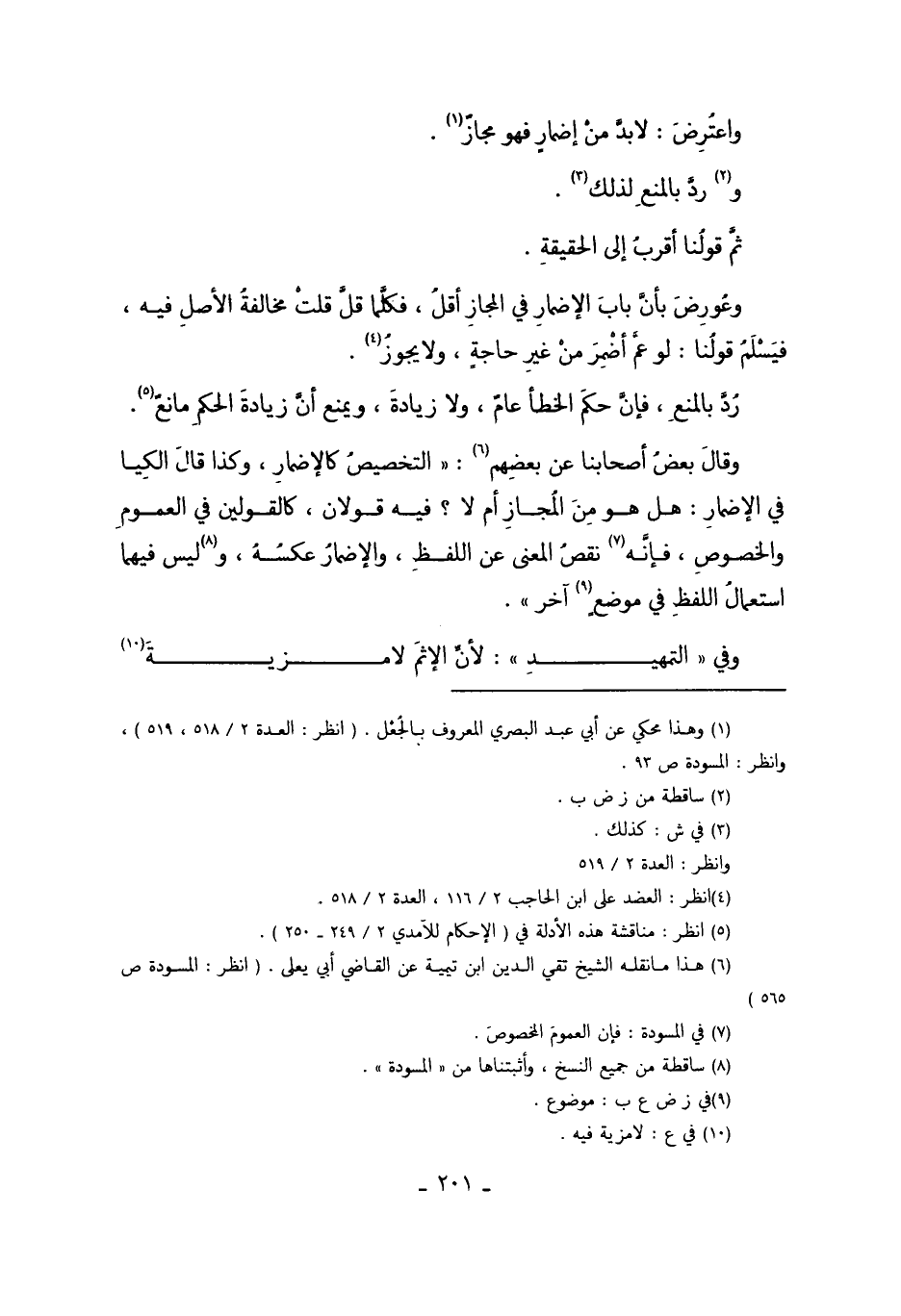 6 هذا ما نقله الشيخ تقي الدين ابن تيمية عن القاضي أبي يعلى. "انظر: المسودة ص565".