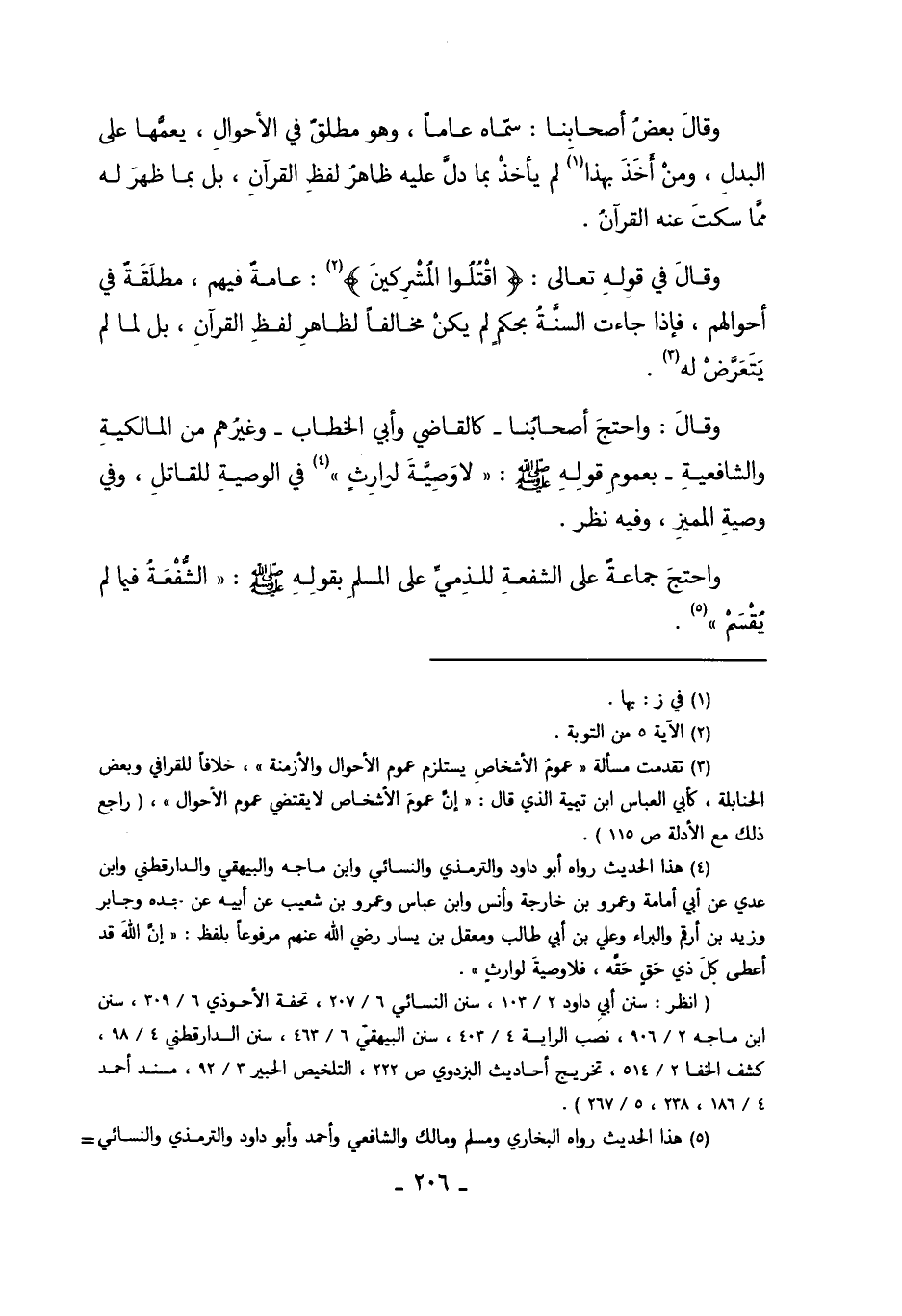3 تقدمت مسألة "عموم الأشخاص يستلزم عموم الأحوال والأزمنة"، خلافاً للقرافي وبعض الحنابلة، كأبي العباس ابن تيمية الذي قال: "إن عموم الأشخاص لا يقتضي عموم الأحوال"، "راجع ذلك مع الأدلة ص115".