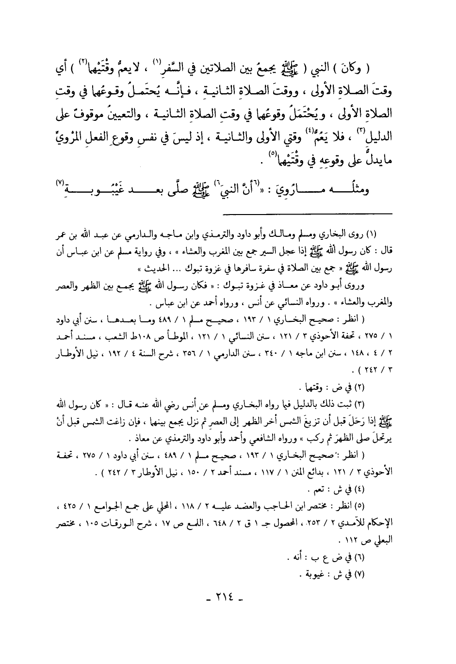 وَكَانَ النَّبِيُّ صَلَّى اللَّهُ عَلَيْهِ وَسَلَّمَ يَجْمَعُ بَيْنَ الصَّلاتَيْنِ فِي السَّفَرِ1،لا يَعُمُّ وَقْتَيْهِمَا2 أَيْ وَقْتَ الصَّلاةِ الأُولَى وَوَقْتَ الصَّلاةِ الثَّانِيَةِ، فَإِنَّهُ يَحْتَمِلُ وُقُوعَهُمَا فِي وَقْتِ الصَّلاةِ الأُولَى وَيَحْتَمِلُ وُقُوعَهُمَا فِي وَقْتِ الصَّلاةِ الثَّانِيَةِ، وَالتَّعْيِينُ مَوْقُوفٌ عَلَى الدَّلِيلِ3، فَلا يعُمُّ4 وَقْتَيْ الأُولَى وَالثَّانِيَةِ، إذْ لَيْسَ فِي نَفْسِ وُقُوعِ الْفِعْلِ الْمَرْوِيِّ مَا يَدُلُّ عَلَى وُقُوعِهِ فِي وَقْتَيْهِمَا5.