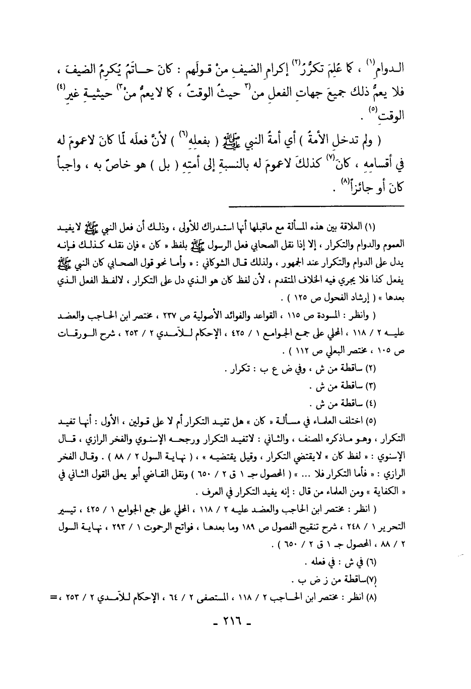 الدَّوَامِ1، كَمَا عُلِمَ تكر2ر إكْرَامُ الضَّيْفِ مِنْ قَوْلِهِمْ: كَانَ حَاتِمُ يُكْرِمُ الضَّيْفَ, فَلا يَعُمُّ ذَلِكَ جَمِيعَ جِهَاتِ الْفِعْلِ مِنْ حَيْثُ الْوَقْتِ كَمَا لا يَعُمُّ مِنْ3 حَيْثِيَّةِ غَيْرِ4 الْوَقْتِ5.