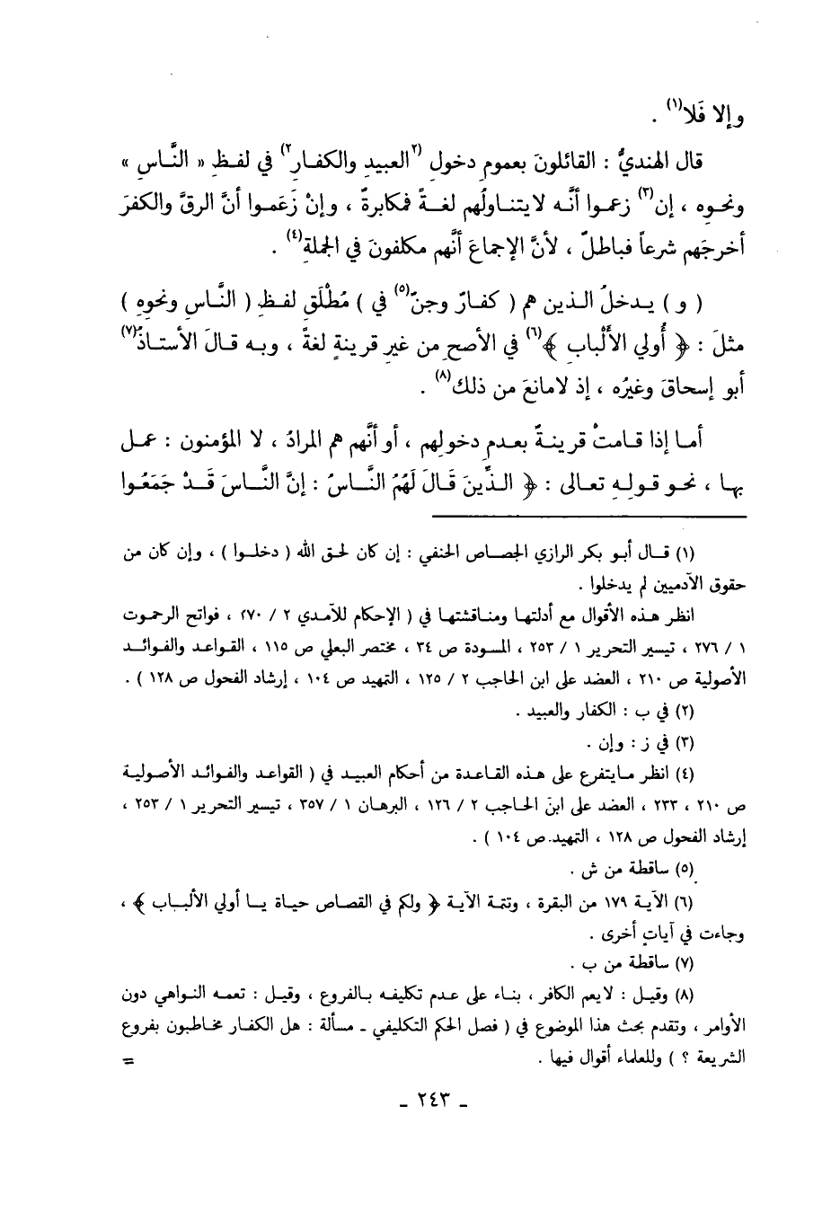 قَالَ الْهِنْدِيُّ: الْقَائِلُونَ بِعُمُومِ دُخُولِ الْعَبِيدِ وَالْكُفَّارِ2 فِي لَفْظِ "النَّاسِ" وَنَحْوِهِ، إنْ3 زَعَمُوا أَنَّهُ لا يَتَنَاوَلُهُمْ لُغَةً فَمُكَابَرَةٌ، وَإِنْ زَعَمُوا أَنَّ الرِّقَّ وَالْكُفْرَ أَخْرَجَهُمْ شَرْعًا فَبَاطِلٌ؛ لأَنَّ الإِجْمَاعَ أَنَّهُمْ مُكَلَّفُونَ فِي الْجُمْلَةِ4.