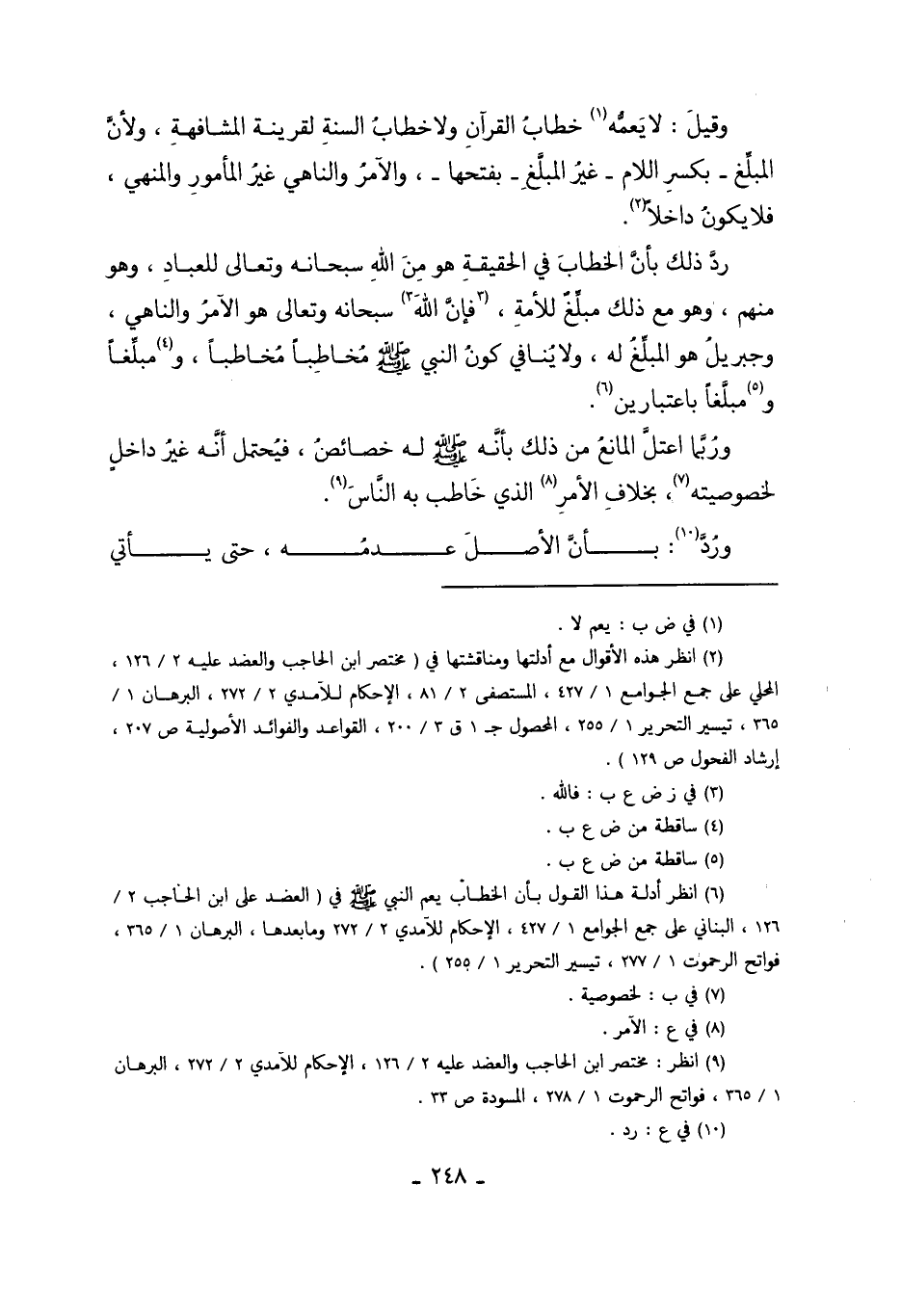 رُدَّ ذَلِكَ بِأَنَّ الْخِطَابَ فِي الْحَقِيقَةِ هُوَ مِنْ اللَّهِ سُبْحَانَهُ وَتَعَالَى لِلْعِبَادِ، وَهُوَ مِنْهُمْ، وَهُوَ مَعَ ذَلِكَ مُبَلِّغٌ لِلْأُمَّةِ؛ فَإِنَّ اللَّهَ3 سُبْحَانَهُ وَتَعَالَى هُوَ الآمِرُ وَالنَّاهِي، وَجِبْرِيلَ هُوَ الْمُبَلِّغُ لَهُ، وَلا يُنَافِي كَوْنَ النَّبِيِّ صَلَّى اللَّهُ عَلَيْهِ وَسَلَّمَ مُخَاطِبًا مُخَاطَبًا وَ4مُبَلِّغًا وَ5مُبَلَّغًا بِاعْتِبَارَيْنِ6.