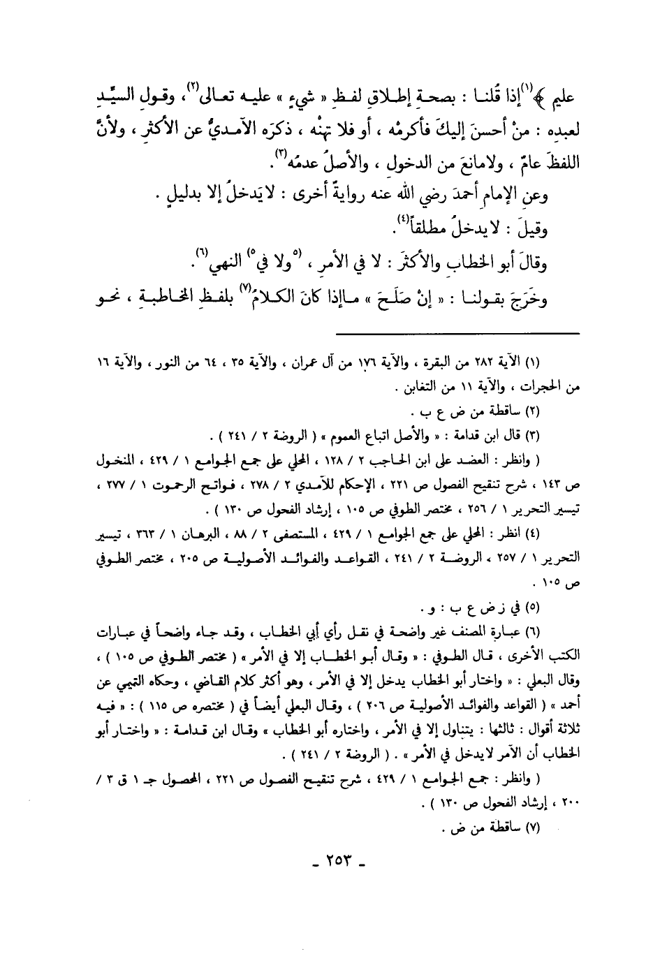 6 عبارة المصنف غير واضحة في نقل رأي أبي الخطاب، وقد جاء واضحاً في عبارات الكتب الأخرى، قال الطوفي: "وقال أبي الخطاب إلا في الأمر" "مختصر الطوفي ص105"، وقال البعلي: "واختار أبو الخطاب يدخل إلا في الأمر، وهو أكثر كلام القاضي، وحكاه التميمي عن أحمد" "القواعد والفوائد الأصولية ص206"، وقال البعلي أيضاً في "مختصره ص115": "فيه ثلاثة أقوال: ثالثها: يتناول إلا في الأمر، واختاره أبو الخطاب" وقال ابن قدامة: "واختار أبو الخطاب أن الآمر لا يدخل في الأمر" "الروضة 2/241".