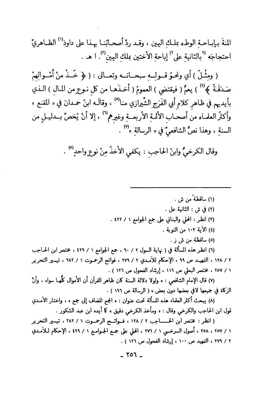 "وَمِثْلَ" أَيْ وَنَحْوُ قَوْلِهِ سُبْحَانَهُ وَتَعَالَى {خُذْ مِنْ أَمْوَالِهِمْ صَدَقَةً} 4 يَعُمُّ "فَيَقْتَضِي" الْعُمُومُ "أَخْذَهَا مِنْ كُلِّ نَوْعٍ مِنْ الْمَالِ الَّذِي بِأَيْدِيهِمْ" فِي ظَاهِرِ كَلامِ أَبِي الْفَرَجِ الشِّيرَازِيِّ مِنَّا5، وَقَالَهُ ابْنُ حَمْدَانَ فِي الْمُقْنِعِ، وَأَكْثَرُ الْعُلَمَاءِ مِنْ أَصْحَابِ الأَئِمَّةِ الأَرْبَعَةِ وَغَيْرُهُمْ6، إلاَّ أَنْ يَخُصَّ بِدَلِيلٍ مِنْ السُّنَّةِ. وَهَذَا نَصُّ الشَّافِعِيِّ فِي الرِّسَالَةِ7.
