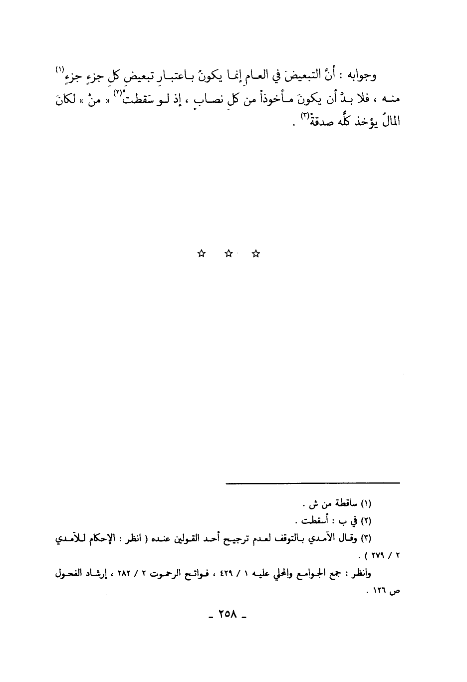 وَجَوَابُهُ: أَنَّ التَّبْعِيضَ فِي الْعَامِّ إنَّمَا يَكُونُ بِاعْتِبَارِ تَبْعِيضِ كُلِّ جُزْءٍ جُزْءٍ1 مِنْهُ، فَلا بُدَّ أَنْ يَكُونَ مَأْخُوذًا مِنْ كُلِّ نِصَابٍ إذْ لَوْ سَقَطَتْ2 "مِنْ" لَكَانَ الْمَالُ يُؤْخَذُ كُلُّهُ صَدَقَةً 3.