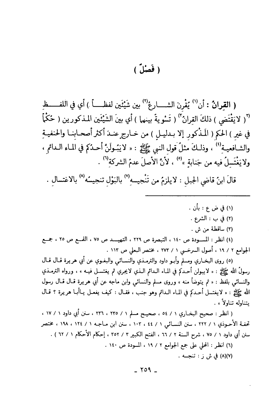 الْقِرَانِ: أَنْ1 يَقْرُنَ الشَّارِعُ2 بَيْنَ شَيْئَيْنِ لَفْظًا" أَيْ فِي اللَّفْظِ "لا يَقْتَضِي" ذَلِكَ الْقُرْآنِ3 "تَسْوِيَةً بَيْنَهُمَا" أَيْ بَيْنَ الشَّيْئَيْنِ الْمَذْكُورَيْنِ "حُكْمًا فِي غَيْرِ" الْحُكْمِ "الْمَذْكُورِ إلاَّ بِدَلِيلٍ" مِنْ خَارِجٍ عِنْدَ أَكْثَرِ أَصْحَابِنَا وَالْحَنَفِيَّةِ وَالشَّافِعِيَّةِ4, وَذَلِكَ مِثْلَ قَوْلِ النَّبِيِّ صَلَّى اللَّهُ عَلَيْهِ وَسَلَّمَ: "لا يَبُولَنَّ أَحَدُكُمْ فِي الْمَاءِ الدَّائِمِ، وَلا يَغْتَسِلُ فِيهِ مِنْ جَنَابَةٍ" 5 لأَنَّ الأَصْلَ عَدَمُ الشَّرِكَةِ6.