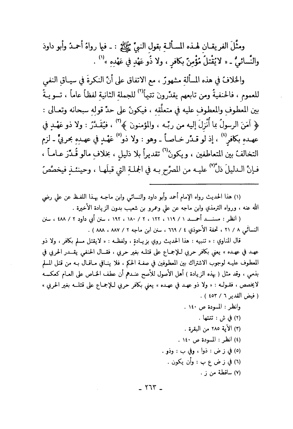 وَالْخِلافُ فِي هَذِهِ الْمَسْأَلَةِ مَشْهُورٌ، مَعَ الاتِّفَاقِ عَلَى أَنَّ النَّكِرَةَ فِي سِيَاقِ النَّفْيِ لِلْعُمُومِ، فَالْحَنَفِيَّةُ وَمَنْ تَابَعَهُمْ يُقَدِّرُونَ تَتْمِيمًا2 لِلْجُمْلَةِ الثَّانِيَةِ لَفْظًا عَامًّا، تَسْوِيَةً بَيْنَ الْمَعْطُوفِ وَالْمَعْطُوفِ عَلَيْهِ فِي مُتَعَلِّقِهِ, فَيَكُونُ عَلَى حَدِّ قَوْله تَعَالَى: {آمَنَ الرَّسُولُ بِمَا أُنْزِلَ إلَيْهِ مِنْ رَبِّهِ وَالْمُؤْمِنُونَ} 3 فَيُقَدَّرُ: وَلا ذُو عَهْدٍ فِي عَهْدِهِ بِكَافِرٍ4, إذْ لَوْ قَدَّرَ خَاصًّا - وَهُوَ وَلا ذُو5 عَهْدٍ فِي عَهْدِهِ بِحَرْبِيٍّ- لَزِمَ التَّخَالُفُ بَيْنَ الْمُتَعَاطِفَيْنِ, وَيَكُونُ6 تَقْدِيرًا بِلا دَلِيلٍ، بِخِلافِ مَا لَوْ قَدَّرَ عَامًّا, فَإِنَّ الدَّلِيلَ دَلَّ7 عَلَيْهِ مِنْ الْمُصَرَّحِ بِهِ فِي الْجُمْلَةِ الَّتِي قَبْلَهَا, وَحِينَئِذٍ فَيُخَصَّصُ
