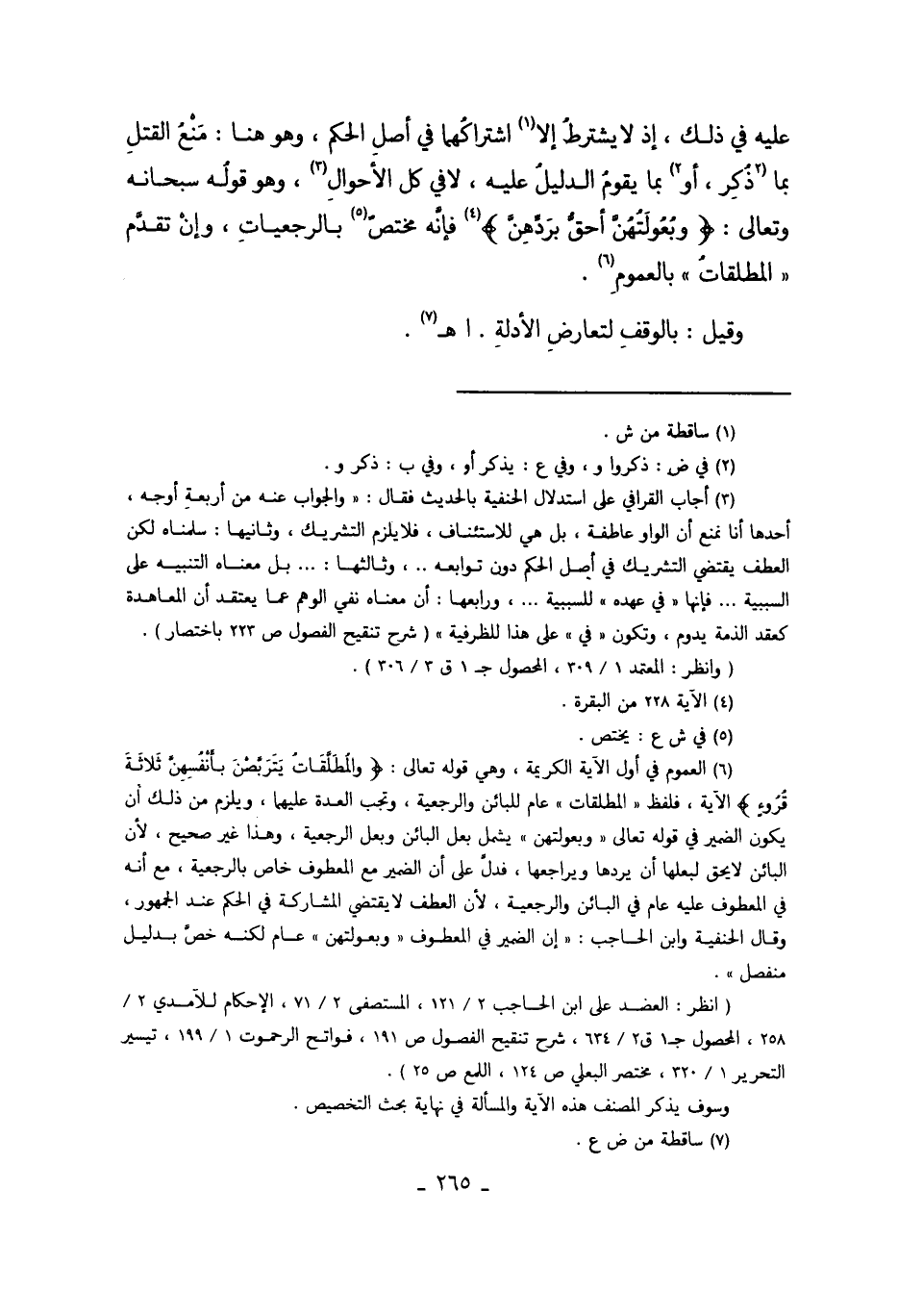 عَلَيْهِ فِي ذَلِكَ, إذْ لا يُشْتَرَطُ إلا1 اشْتِرَاكُهُمَا فِي أَصْلِ الْحُكْمِ، وَهُوَ هُنَا: مَنْعُ الْقَتْلِ بِمَا ذَكَرَ. أَوْ2 بِمَا يَقُومُ الدَّلِيلُ عَلَيْهِ، لا فِي كُلِّ الأَحْوَالِ3: وَهُوَ قَوْلُهُ سُبْحَانَهُ وَتَعَالَى {وَبُعُولَتُهُنَّ أَحَقُّ بِرَدِّهِنَّ} 4 فَإِنَّهُ مُخْتَصٌّ5 بِالرَّجْعِيَّاتِ, وَإِنْ تَقَدَّمَ الْمُطَلَّقَاتُ بِالْعُمُومِ6.