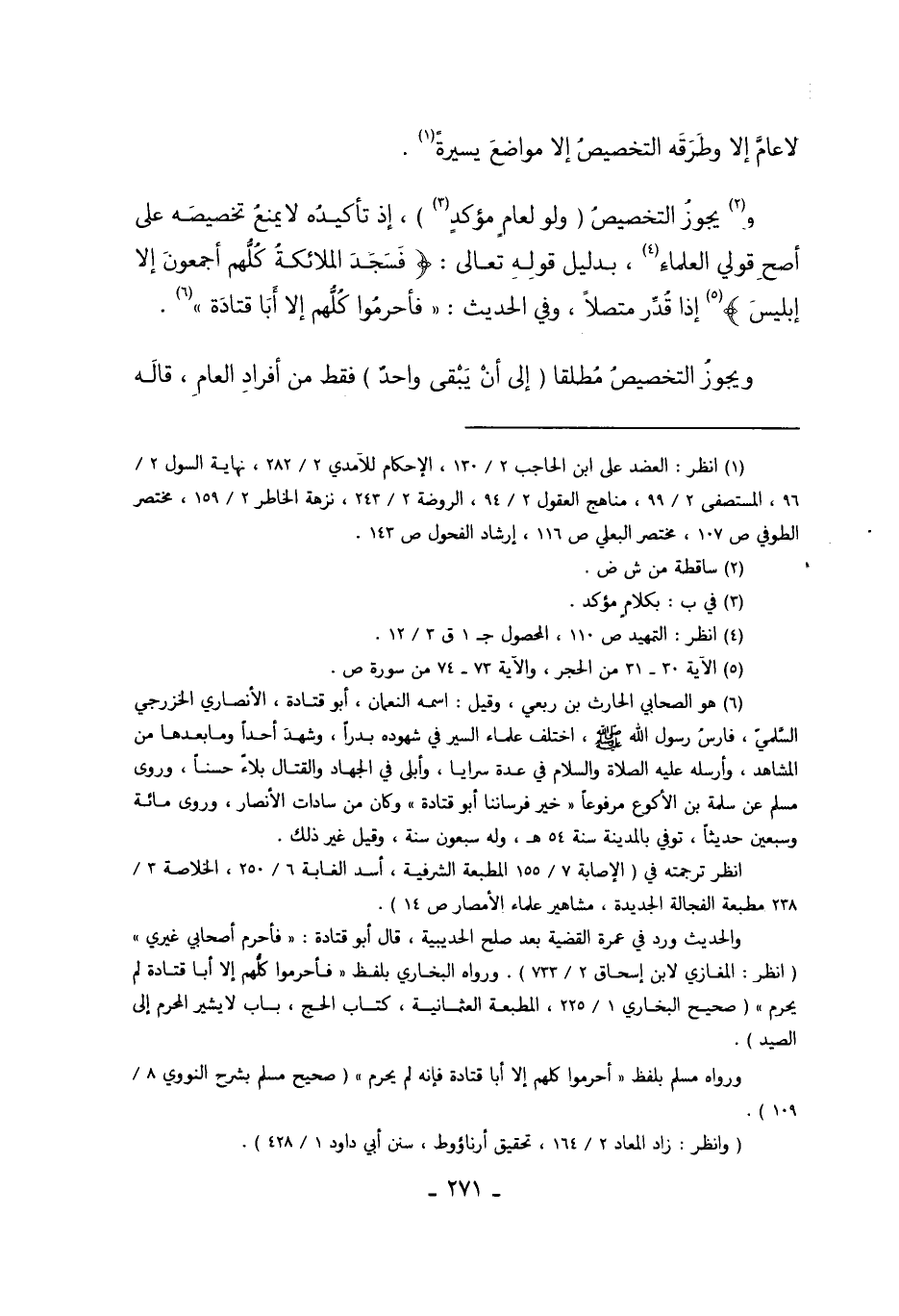 وَ2يَجُوزُ التَّخْصِيصُ "وَلَوْ لِعَامٍّ مُؤَكَّدٍ3" إذْ تَأْكِيدُهُ لا يَمْنَعُ تَخْصِيصَهُ عَلَى أَصَحِّ قَوْلَيْ الْعُلَمَاءِ4، بِدَلِيلِ قَوْله تَعَالَى: {فَسَجَدَ الْمَلائِكَةُ كُلُّهُمْ أَجْمَعُونَ إِلَّا إِبْلِيسَ} 5 إذَا قَدَّرَ مُتَّصِلاً, وَفِي الْحَدِيثِ "فَأَحْرَمُوا كُلُّهُمْ إلاَّ أَبَا قَتَادَةَ" 6.