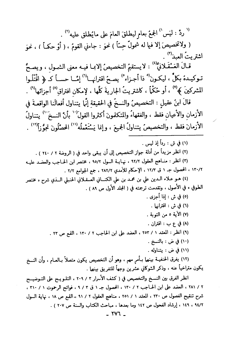قَالَ ابْنُ عَقِيلٍ: التَّخْصِيصُ وَالنَّسْخُ فِي الْحَقِيقَةِ إنَّمَا يَتَنَاوَلُ أَفْعَالَنَا الْوَاقِعَةَ فِي الأَزْمَانِ وَالأَعْيَانِ فَقَطْ. وَالْفُقَهَاءُ وَالْمُتَكَلِّمُونَ تُكَلِّمُونَ أَكْثَرُوا الْقَوْلَ بِأَنَّ النَّسْخَ10 يَتَنَاوَلُ الأَزْمَانَ فَقَطْ، وَالتَّخْصِيصُ يَتَنَاوَلُ الْجَمِيعَ, وَإِنَّمَا يَسْتَعْمِلُهُ11 الْمُحَصِّلُونَ تَجَوُّزًا12.