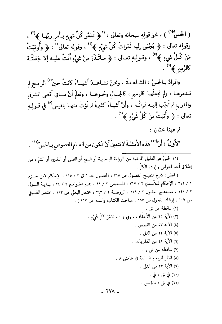 "الْحِسِّ 1 " نَحْوُ قَوْلِهِ سُبْحَانَهُ وَتَعَالَى:2 {تُدَمِّرُ كُلَّ شَيْءٍ بِأَمْرِ رَبِّهَا} 3 وقَوْله تَعَالَى: {يُجْبَى إلَيْهِ ثَمَرَاتُ كُلِّ شَيْءٍ} 4 وقَوْله تَعَالَى: {وَأُوتِيَتْ مِنْ كُلِّ شَيْءٍ} 5. وقَوْله تَعَالَى: {مَا تَذَرُ مِنْ شَيْءٍ أَتَتْ عَلَيْهِ إلاَّ جَعَلَتْهُ كَالرَّمِيمِ} 6.