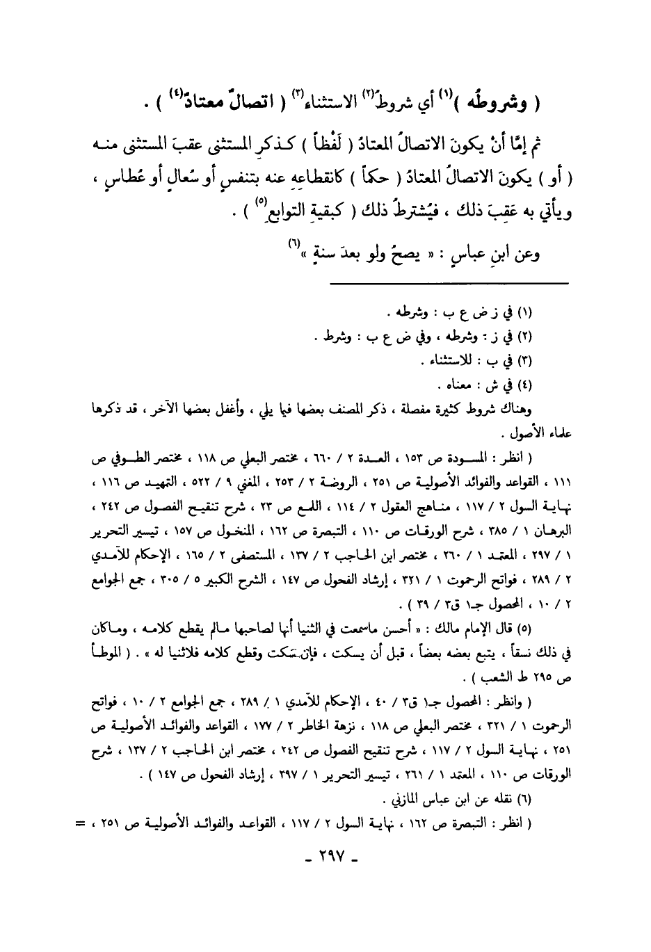 ثُمَّ إمَّا أَنْ يَكُونَ الاتِّصَالُ الْمُعْتَادُ "لَفْظًا" كَذِكْرِ الْمُسْتَثْنَى عَقِبَ الْمُسْتَثْنَى مِنْهُ، "أَوْ" يَكُونَ الاتِّصَالُ الْمُعْتَادُ "حُكْمًا" كَانْقِطَاعِهِ عَنْهُ بِتَنَفُّسٍ أَوْ سُعَالٍ أَوْ عُطَاسٍ, وَيَأْتِي بِهِ عَقِبَ ذَلِكَ، فَيُشْتَرَطَ ذَلِكَ "كَبَقِيَّةِ التَّوَابِعِ5".