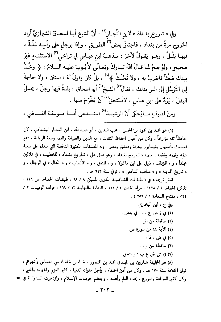 1 هو محمد بن محمود بن الحسن، محب الدين، أبو عبد الله، ابن النجار البغدادي، كان حافظاً ثقة مؤرخاً، وكان من أعيان الحفاظ الثقات، مع الدين والصيانة والفهم وسعة الرواية، سمع الحديث بأصبهان ونيسابور وهراة ودمشق ومصر، وله المصنفات الكثيرة النافعة التي تدل على سعة علمه وفهمه وفضله، منها "تاريخ بغداد" وه ذيل على "تاريخ بغداد" للخطيب، في ثلاثين مجلداً، وهو "المؤتلف" ذيل على ابن ماكولا، و "المتفق" و "الأنساب" و "الكمال" في الرجال، و "تاريخ المدينة" و "مناقب الشافعي" توفي سنة 643هـ.