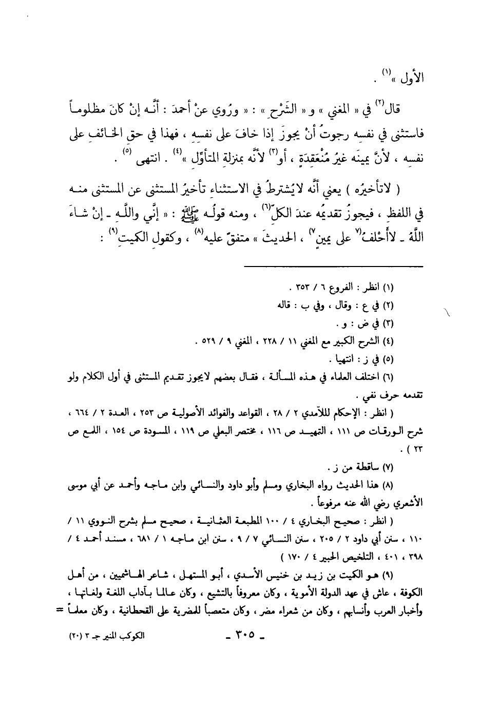"لا تَأْخِيرُهُ" يَعْنِي أَنَّهُ لا يُشْتَرَطُ فِي الاسْتِثْنَاءِ تَأْخِيرُ الْمُسْتَثْنَى عَنْ الْمُسْتَثْنَى مِنْهُ فِي اللَّفْظِ. فَيَجُوزُ تَقْدِيمُهُ عِنْدَ الْكُلِّ6, وَمِنْهُ قَوْلُهُ صَلَّى اللَّهُ عَلَيْهِ وَسَلَّمَ: "إنِّي وَاَللَّهِ -إنْ شَاءَ اللَّهُ- لا أَحْلِفُ عَلَى يَمِينٍ" 7 الْحَدِيثَ مُتَّفَقٌ عَلَيْهِ8، وَكَقَوْلِ الْكُمَيْتِ9: