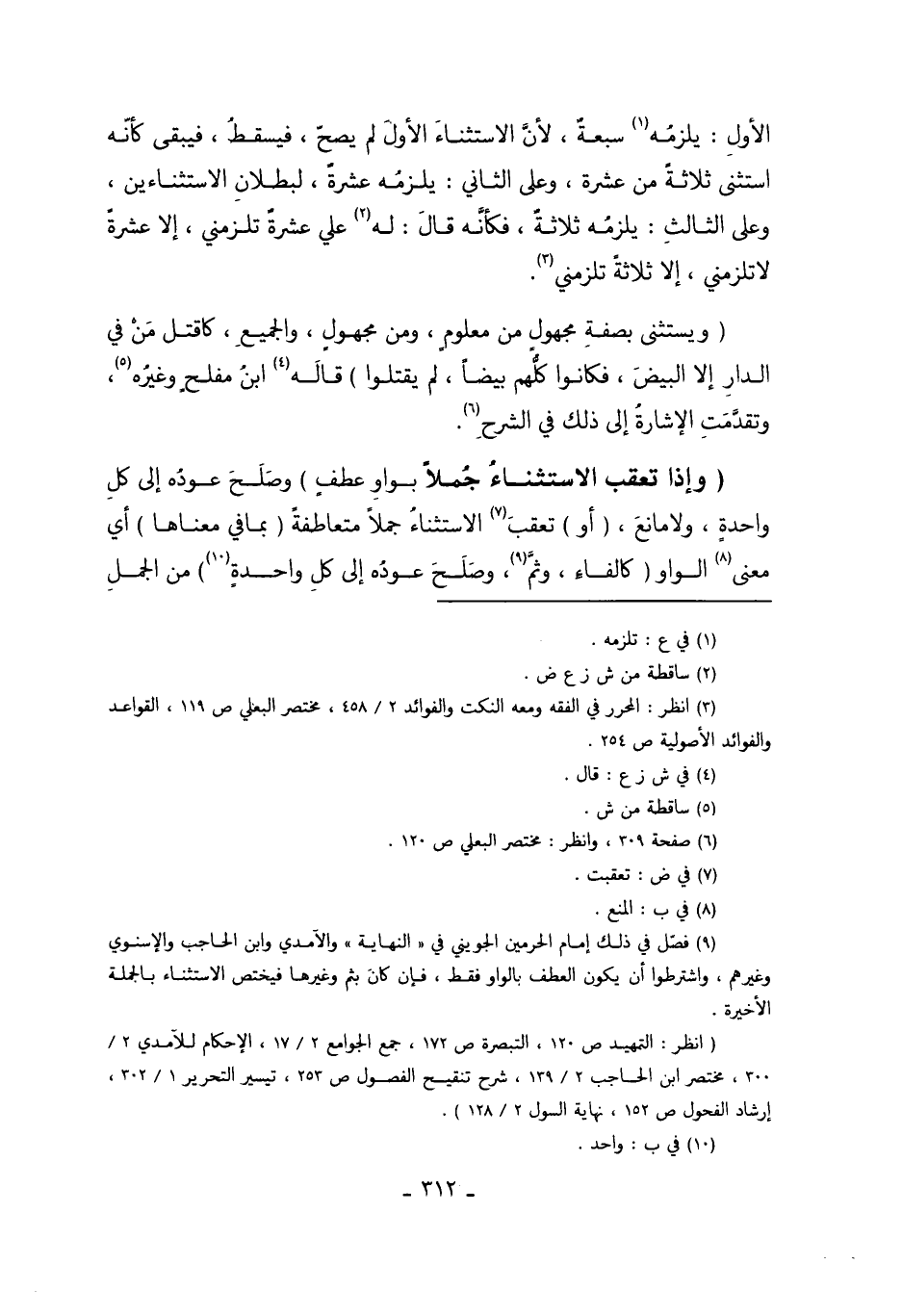 9 فصل في ذلك إمام الحرمين الجويني في "النهاية" والآمدي وابن الحاجب والإسنوي وغيرهم، واشترطوا أن يكون العطف بالواو فقط، فإن كان بثم وغيرها فيختص الاستثناء بالجملة الأخيرة.