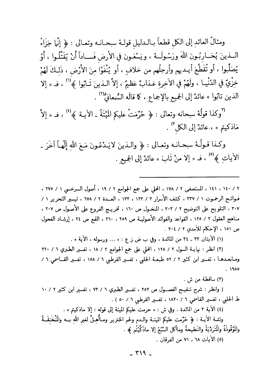 وَمِثَالُ الْعَائِدِ إلَى الْكُلِّ قَطْعًا بِالدَّلِيلِ قَوْلُهُ سُبْحَانَهُ وَتَعَالَى: {إنَّمَا جَزَاءُ الَّذِينَ يُحَارِبُونَ اللَّهَ وَرَسُولَهُ وَيَسْعَوْنَ فِي الأَرْضِ فَسَادًا أَنْ يُقَتَّلُوا أَوْ يُصَلَّبُوا أَوْ تُقَطَّعَ أَيْدِيهِمْ وَأَرْجُلُهُمْ مِنْ خِلافٍ أَوْ يُنْفَوْا مِنْ الأَرْضِ ذَلِكَ لَهُمْ خِزْيٌ فِي الدُّنْيَا وَلَهُمْ فِي الآخِرَةِ عَذَابٌ عَظِيمٌ إلاَّ الَّذِينَ تَابُوا} 1 فَـ {إلاَّ الَّذِينَ تَابُوا} عَائِدٌ إلَى الْجَمِيعِ بِالإِجْمَاعِ, كَمَا قَالَهُ السَّمْعَانِيُّ2.