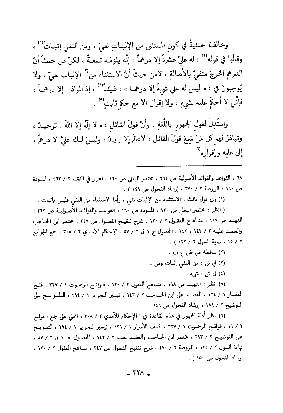 وَاسْتَدَلَّ لِقَوْلِ الْجُمْهُورِ بِاللُّغَةِ وَأَنَّ قَوْلَ الْقَائِلِ "لا إلَهَ إلاَّ اللَّهُ" تَوْحِيدٌ, وَتَبَادَرَ فَهْمُ كُلِّ مَنْ سَمِعَ قَوْلَ الْقَائِلِ: لا عَالِمَ إلاَّ زَيْدٌ, وَلَيْسَ لَك عَلَيَّ إلاَّ دِرْهَمٌ إلَى عِلْمِهِ وَإِقْرَارِهِ6.