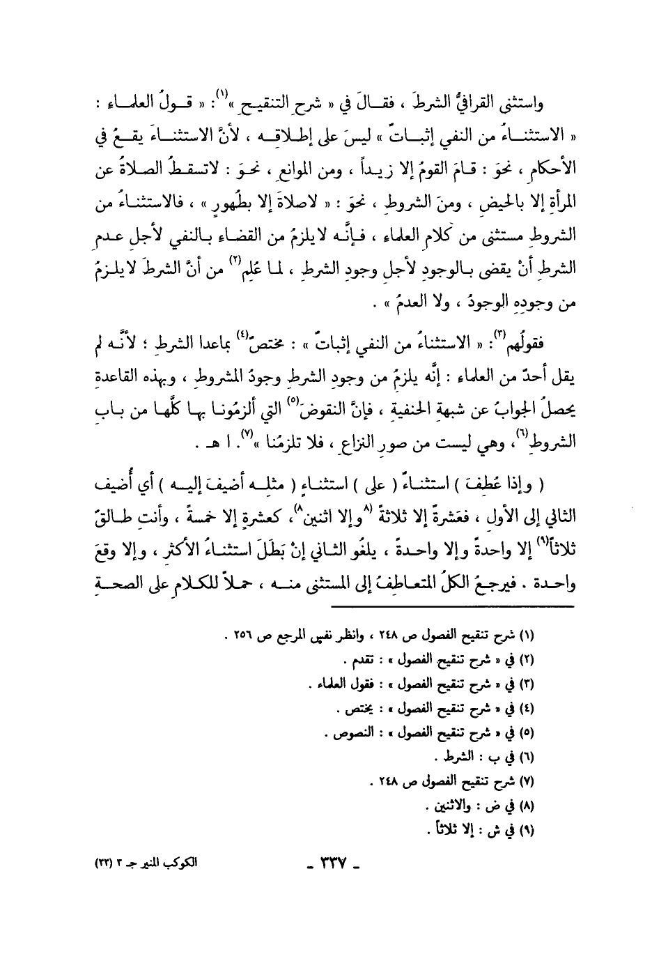 فَقَوْلُهُمْ3: الاسْتِثْنَاءُ مِنْ النَّفْيِ إثْبَاتٌ: مُخْتَصٌّ4 بِمَا عَدَا الشَّرْطَ؛ لأَنَّهُ لَمْ يَقُلْ أَحَدٌ مِنْ الْعُلَمَاءِ: إنَّهُ يَلْزَمُ مِنْ وُجُودِ الشَّرْطِ وُجُودُ الْمَشْرُوطِ. وَبِهَذِهِ الْقَاعِدَةُ يَحْصُلُ الْجَوَابُ عَنْ شُبْهَةِ الْحَنَفِيَّةِ، فَإِنَّ النُّقُوضَ5 الَّتِي أَلْزَمُونَا بِهَا كُلَّهَا مِنْ بَابِ الشُّرُوطِ6, وَهِيَ لَيْسَتْ مِنْ صُوَرِ النِّزَاعِ فَلا تَلْزَمُنَا7. اهـ.
