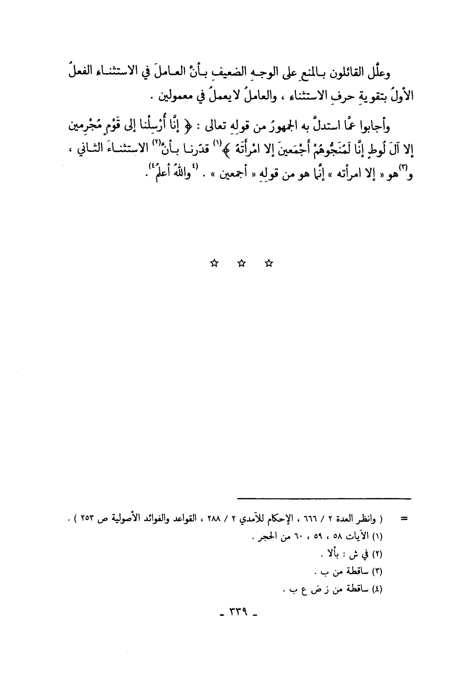 وَأَجَابُوا عَمَّا اسْتَدَلَّ بِهِ الْجُمْهُورُ مِنْ قَوْله تَعَالَى: {إنَّا أُرْسِلْنَا إلَى قَوْمٍ مُجْرِمِينَ إلاَّ آلَ لُوطٍ إنَّا لَمُنَجُّوهُمْ أَجْمَعِينَ إلاَّ امْرَأَتَهُ} 1 قَدَّرْنَا بِأَنَّ2 الاسْتِثْنَاءَ الثَّانِيَ، وَ3هُوَ "إلاَّ امْرَأَتَهُ" إنَّمَا هُوَ مِنْ قَوْلِهِ "أَجْمَعِينَ" وَاَللَّهُ أَعْلَمُ4.