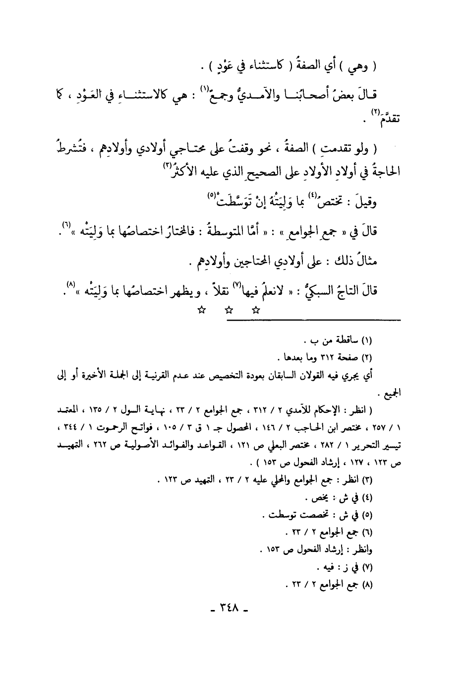 "وَلَوْ تَقَدَّمَتْ" الصِّفَةُ، نَحْوَ وَقَفْتُ عَلَى مُحْتَاجِي أَوْلادِي وَأَوْلادِهِمْ فَتُشْتَرَطَ الْحَاجَةُ فِي أَوْلادِ الأَوْلادِ عَلَى الصَّحِيحِ الَّذِي عَلَيْهِ الأَكْثَرُ3.