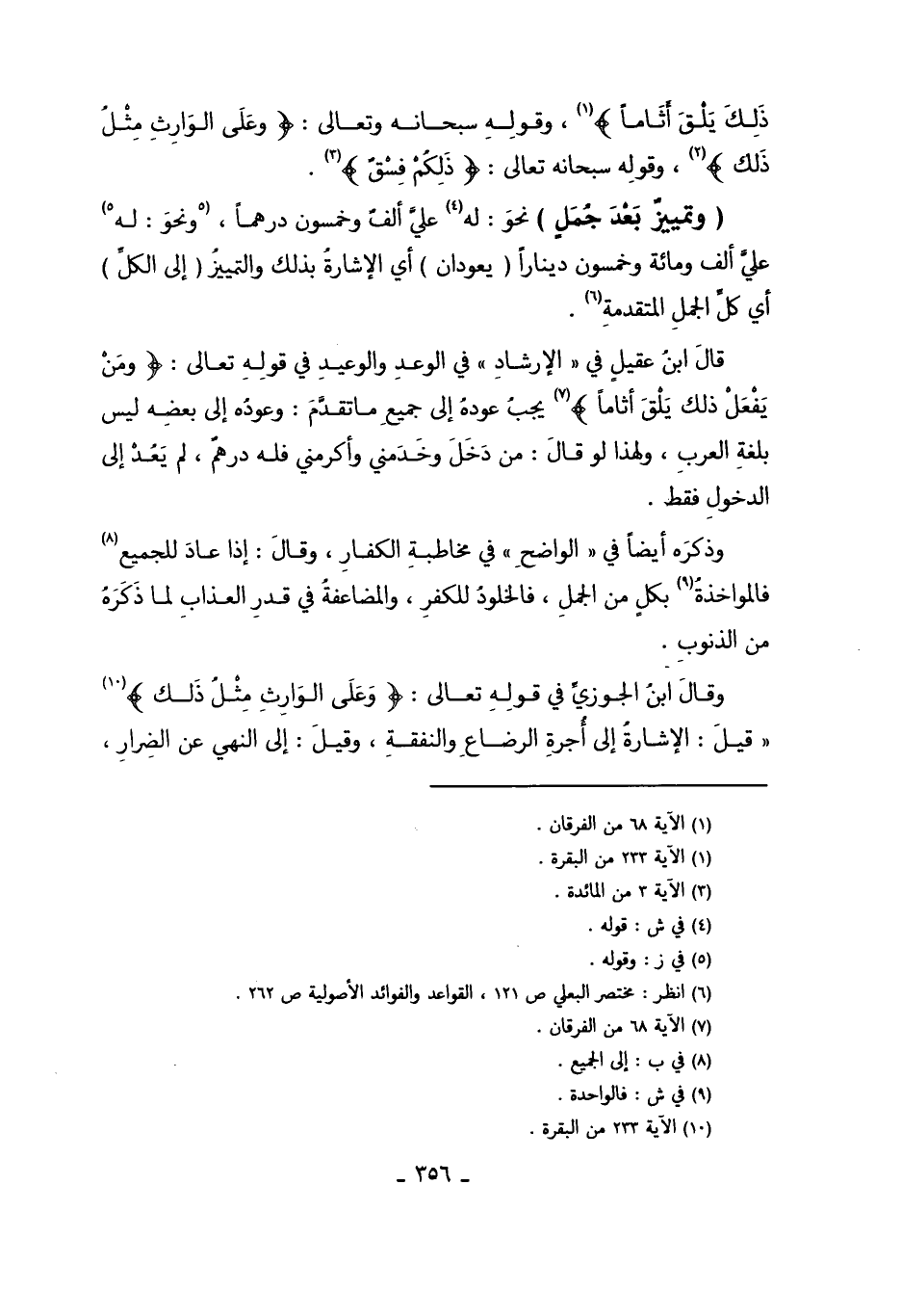 قَالَ ابْنُ عَقِيلٍ فِي الإِرْشَادِ فِي الْوَعْدِ وَالْوَعِيدِ فِي قَوْله تَعَالَى: {وَمَنْ يَفْعَلْ ذَلِكَ يَلْقَ أَثَامًا} 7 يَجِبُ عَوْدُهُ إلَى جَمِيعِ مَا تَقَدَّمَ: وَعَوْدُهُ إلَى بَعْضِهِ لَيْسَ بِلُغَةِ الْعَرَبِ, وَلِهَذَا لَوْ قَالَ: مَنْ دَخَلَ وَخَدَمَنِي وَأَكْرَمَنِي فَلَهُ دِرْهَمٌ، لَمْ يَعُدْ إلَى الدُّخُولِ فَقَطْ.