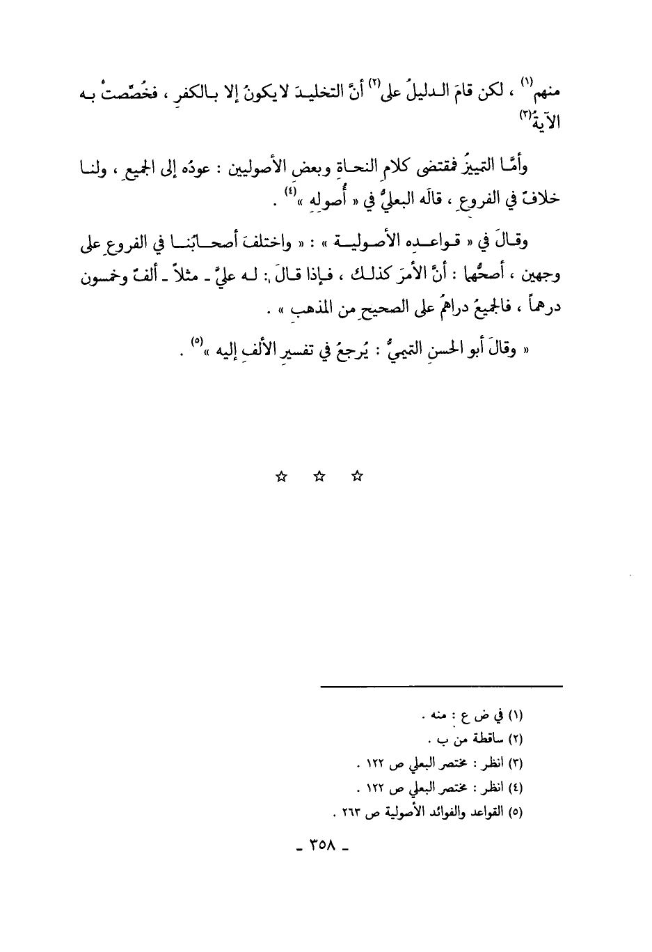 وَقَالَ فِي قَوَاعِدِهِ الأُصُولِيَّةِ: وَاخْتَلَفَ أَصْحَابُنَا فِي الْفُرُوعِ عَلَى وَجْهَيْنِ, أَصَحُّهُمَا: أَنَّ الأَمْرَ كَذَلِكَ, فَإِذَا قَالَ: لَهُ عَلَيَّ -مَثَلاً- أَلْفٌ وَخَمْسُونَ دِرْهَمًا, فَالْجَمِيعُ دَرَاهِمُ عَلَى الصَّحِيحِ مِنْ الْمَذْهَبِ.