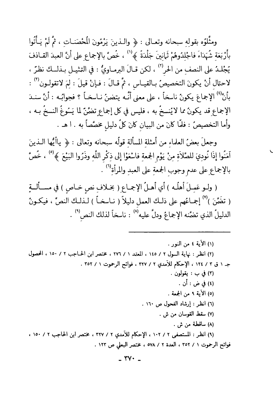وَمَثَّلُوهُ بِقَوْلِهِ سُبْحَانَهُ وَتَعَالَى: {وَاَلَّذِينَ يَرْمُونَ الْمُحْصَنَاتِ ثُمَّ لَمْ يَأْتُوا بِأَرْبَعَةِ شُهَدَاءَ فَاجْلِدُوهُمْ ثَمَانِينَ جَلْدَةً} 1 خُصَّ بِالإِجْمَاعِ عَلَى أَنَّ الْعَبْدَ الْقَاذِفَ يُجْلَدُ عَلَى النِّصْفِ مِنْ الْحُرِّ2، لَكِنْ قَالَ الْبِرْمَاوِيُّ: فِي التَّمْثِيلِ بِذَلِكَ نَظَرٌ، لاحْتِمَالِ أَنْ يَكُونَ التَّخْصِيصُ بِالْقِيَاسِ، ثُمَّ قَالَ فَإِنْ قِيلَ: لِمَ لا تَقُولُونَ3 بِأَنَّ4 الإِجْمَاعَ يَكُونُ نَاسِخًا، عَلَى مَعْنَى أَنَّهُ يَتَضَمَّنُ نَاسِخًا؟ فَجَوَابُهُ: أَنَّ سَنَدَ الإِجْمَاعِ قَدْ يَكُونُ مِمَّا لا يُنْسَخُ بِهِ, فَلَيْسَ فِي كُلِّ إجْمَاعٍ تَضَمُّنٌ لِمَا يَسُوغُ النَّسْخُ بِهِ, وَأَمَّا التَّخْصِيصُ: فَلَمَّا كَانَ مِنْ الْبَيَانِ كَانَ كُلُّ دَلِيلٍ مُخَصَّصًا بِهِ. اهـ.