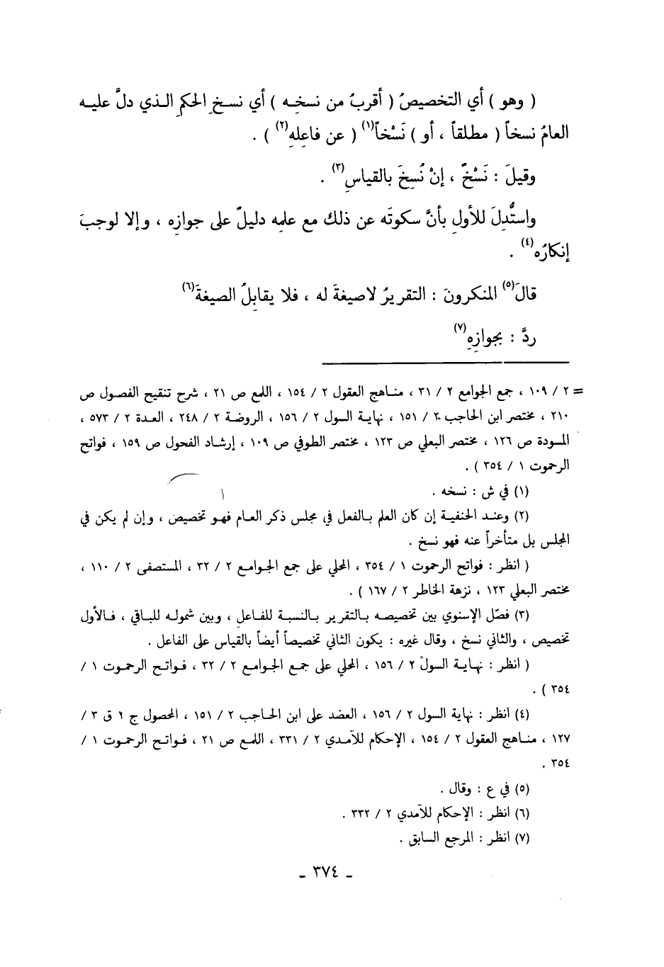 3 فصل الإسنوي بين تخصيصه بالتقرير بالنسبة للفاعل، وبين شمول للباقي، فالأول تخصيص، والثاني نسخ، وقال غيره: يكون الثاني تخصيصاً أيضاً بالقياس على الفاعل.