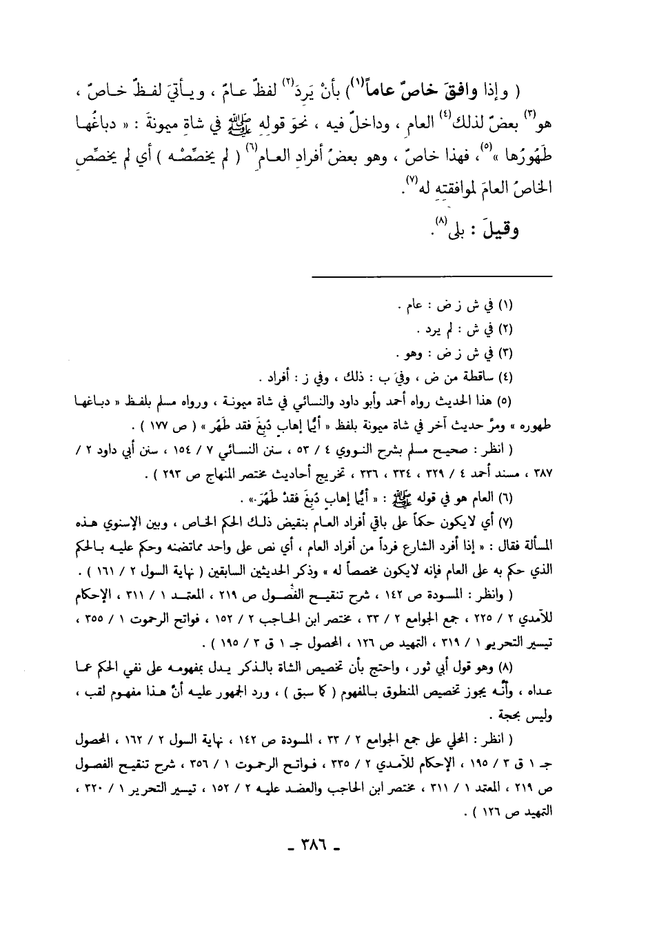 "وَإِذَا وَافَقَ خَاصٌّ عَامًّا 1" بِأَنْ. يَرِدْ2 لَفْظٌ عَامٌّ، وَيَأْتِي لَفْظٌ خَاصٌّ، هُوَ3 بَعْضٌ لِذَلِكَ4 الْعَامِّ وَدَاخِلٌ فِيهِ، نَحْوُ قَوْلِهِ صَلَّى اللَّهُ عَلَيْهِ وَسَلَّمَ فِي شَاةِ مَيْمُونَةَ: "دِبَاغُهَا طُهُورُهَا" 5 فَهَذَا خَاصٌّ وَهُوَ بَعْضُ أَفْرَادِ الْعَامِّ6 "لَمْ يُخَصِّصْهُ" أَيْ لَمْ يُخَصِّصْ الْخَاصُّ الْعَامَّ لِمُوَافَقَتِهِ لَهُ7.