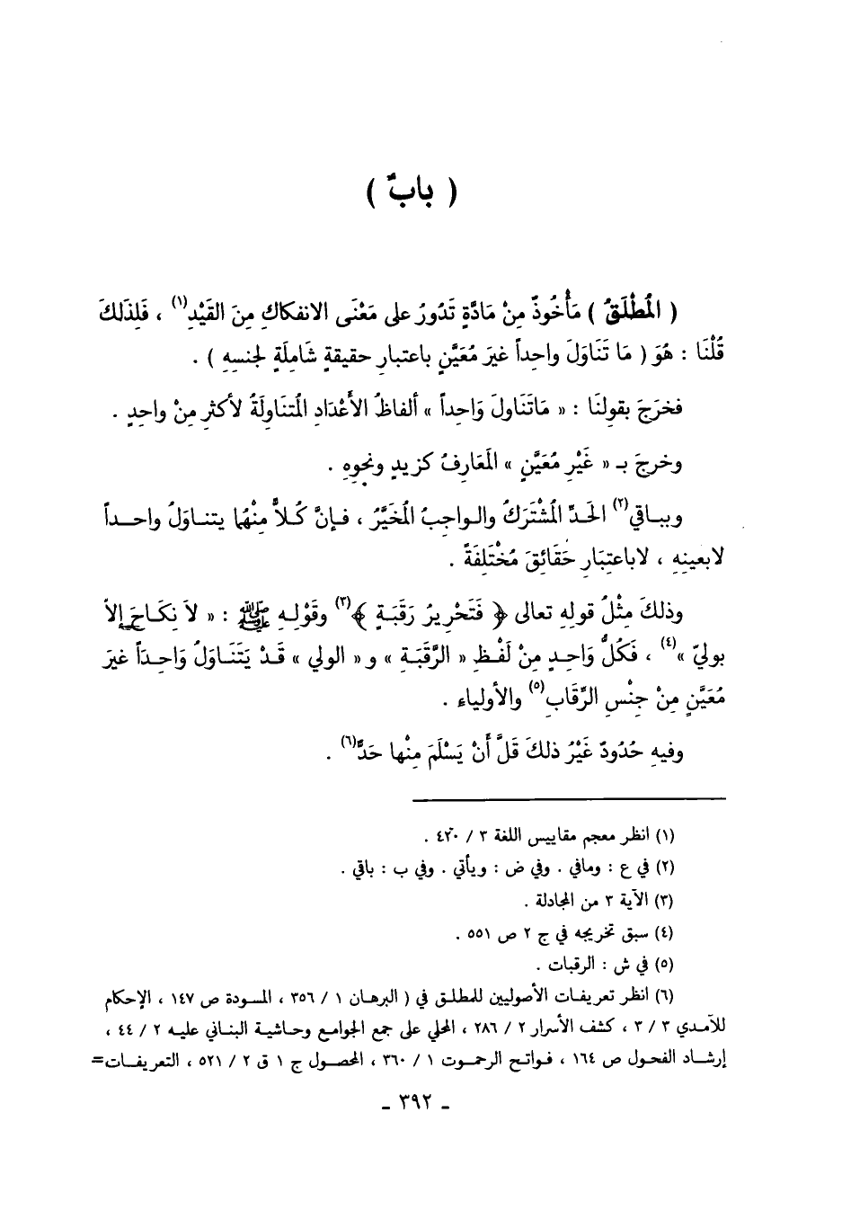 "الْمُطْلَقِ" مَأْخُوذٌ مِنْ مَادَّةٍ تَدُورُ عَلَى مَعْنَى الانْفِكَاكِ مِنْ الْقَيْدِ1، فَلِذَلِكَ قُلْنَا: هُوَ [مَا تَنَاوَلَ وَاحِدًا غَيْرَ مُعَيَّنٍ بِاعْتِبَارِ حَقِيقَةٍ شَامِلَةٍ لِجِنْسِهِ] .