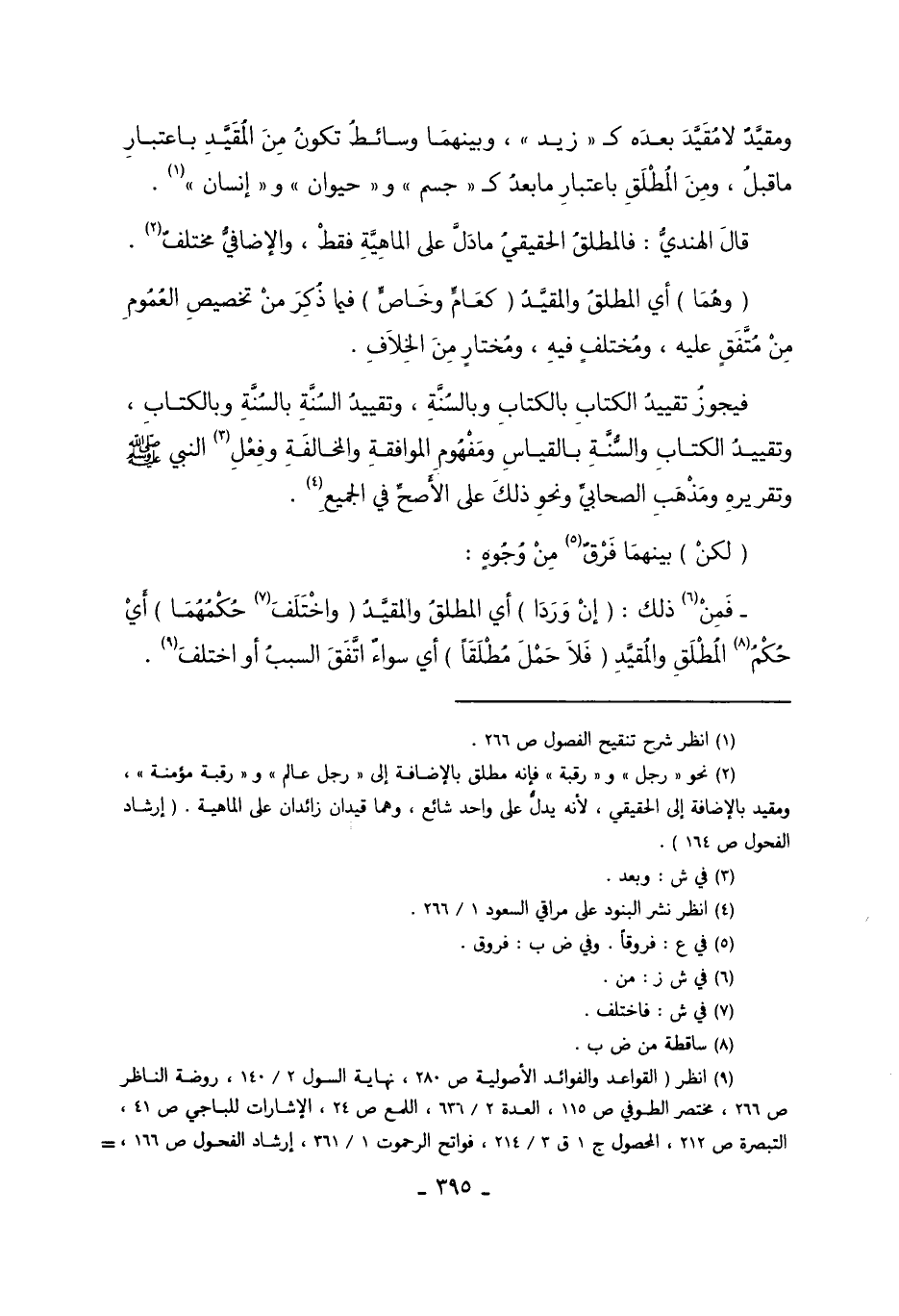 2 نحو"رجل" و "رقبة" فإنه مطلق بالإضافة إلى "رجل عالم" و"رقبة مؤمنة"، ومقيد بالإضافة إلى الحقيقي، لأنه يدل على واحد شائع، وهما قيدان زائدان على الماهية. "إرشاد الفحول ص164".